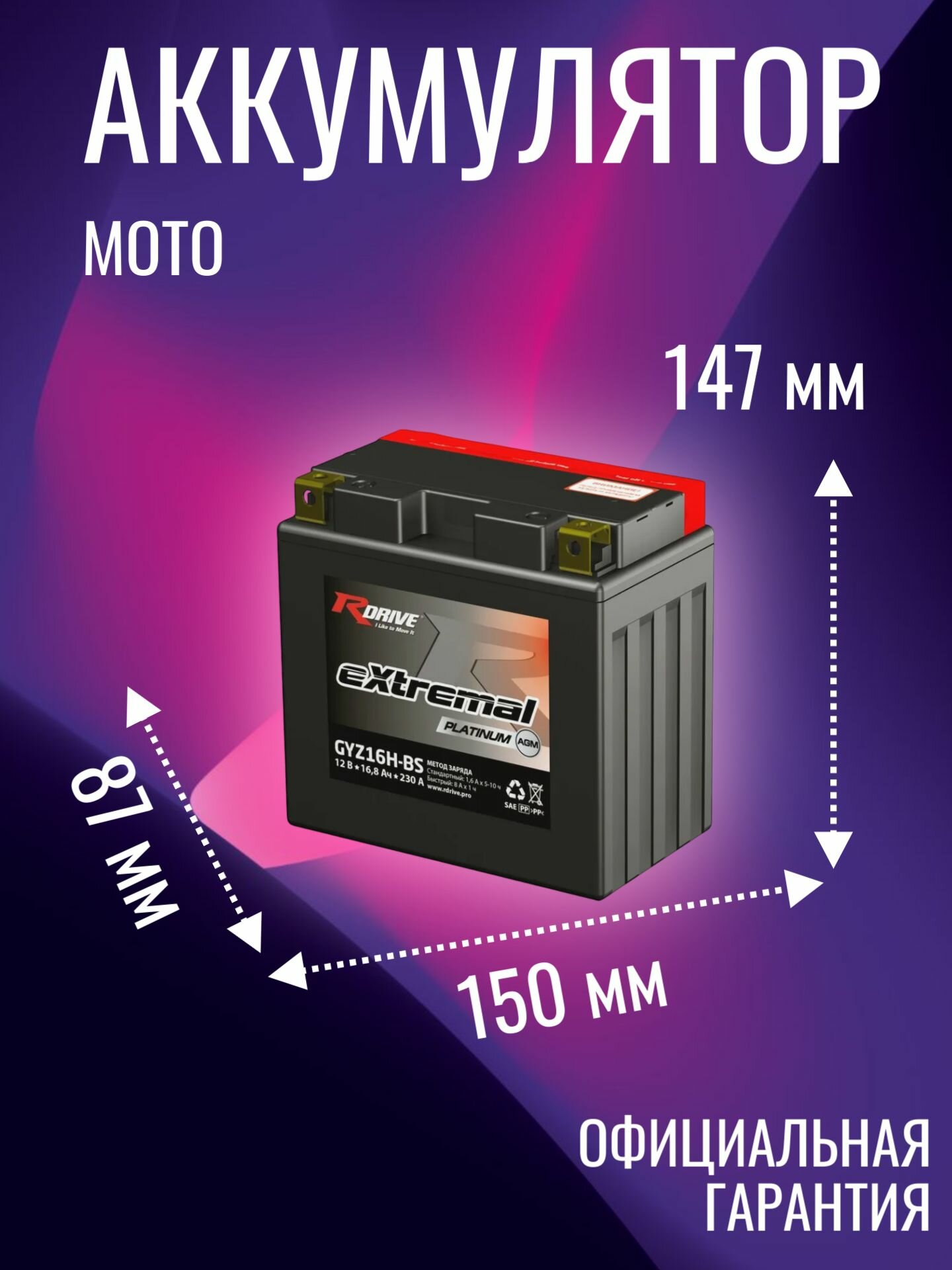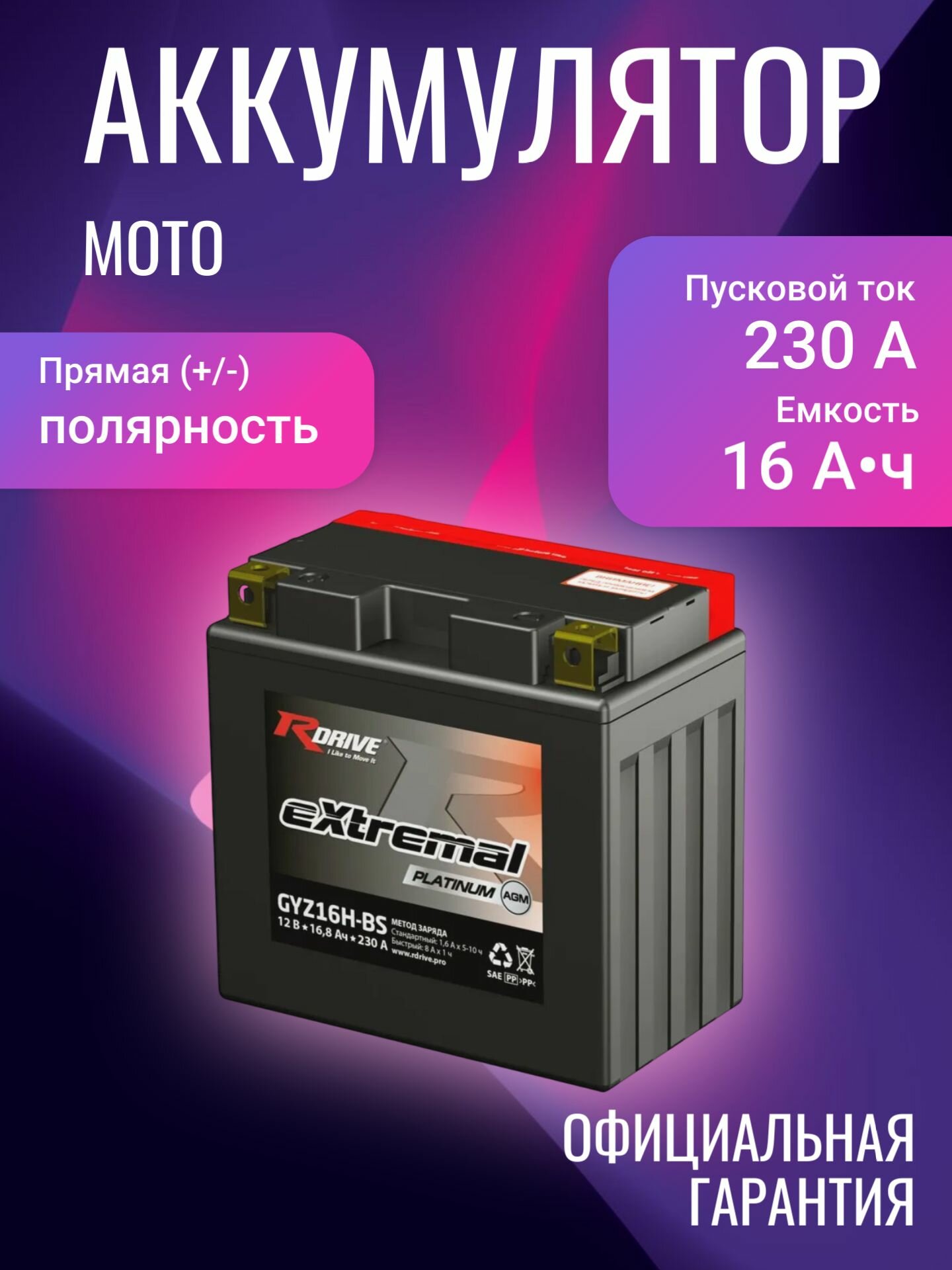 Аккумулятор мотоциклетный RDrive eXtremal PLATINUM GYZ16H-BS 12В 16Ач 230А интересное: