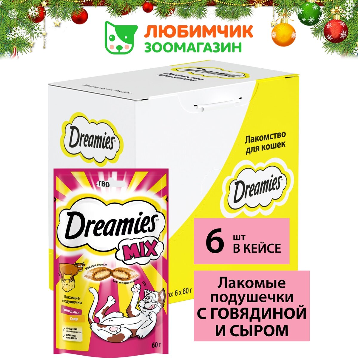 Лакомство для кошек DREAMIES MIX (Микс) говядина, сыр 60г (упаковка - 6 шт)