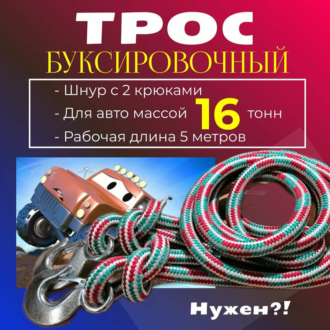 Трос буксировочный для автомобиля 16 т (16 тонн) 5 метров шнур канат с 2 крюками карабинами интересное: