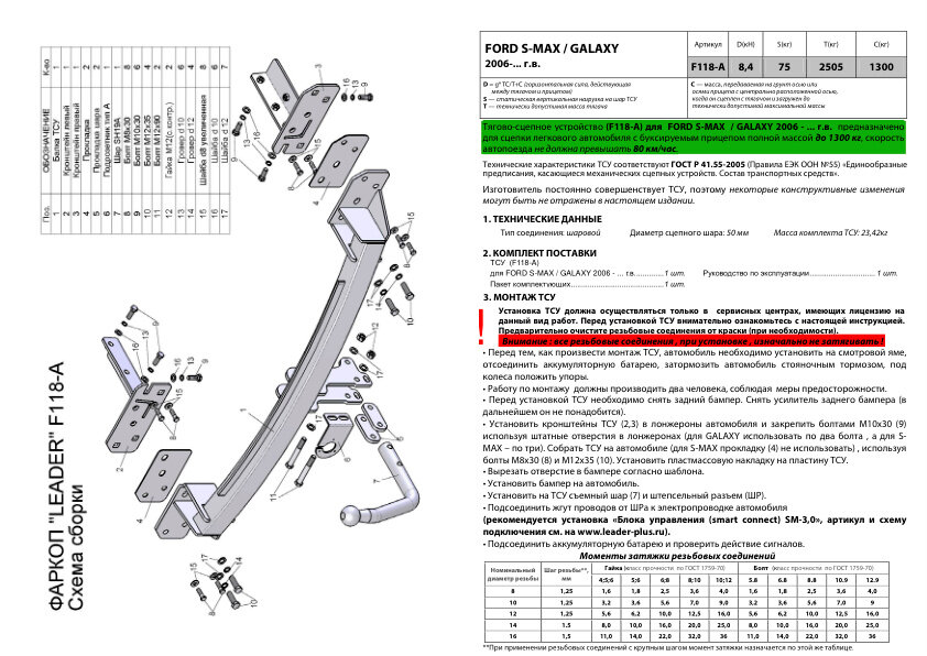 Фаркоп с электрикой Smart Connect для Форд С-Макс (WA6) (2006-2015), Форд Гэлэкси (2006-2015) Лидер-Плюс интересное: