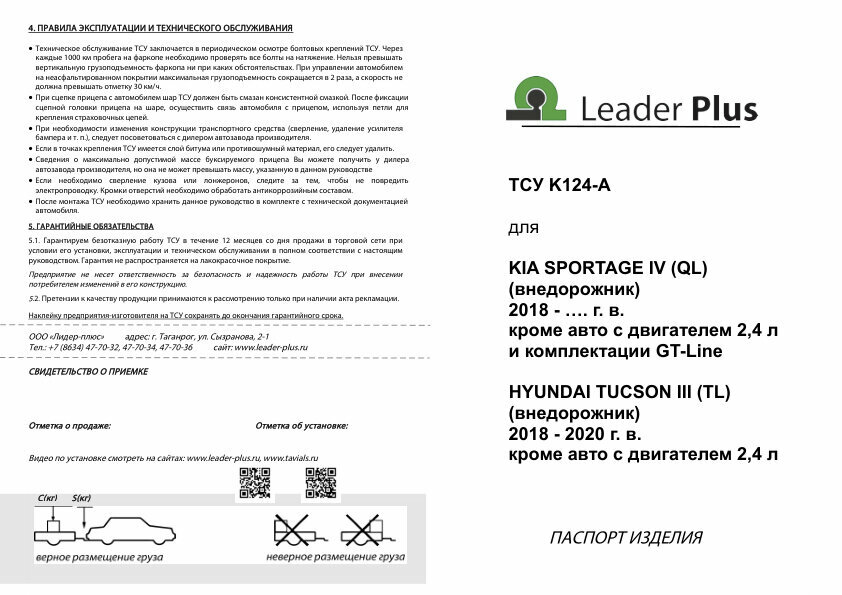 Фаркоп с электрикой Smart Connect для Kia Sportage IV (QL) рестайл (2018-2022), Hyundai Tucson III (TL) рестайл (2018-2021) кроме авто с двигателем 2,4 л Лидер-Плюс K124-A интересное:
