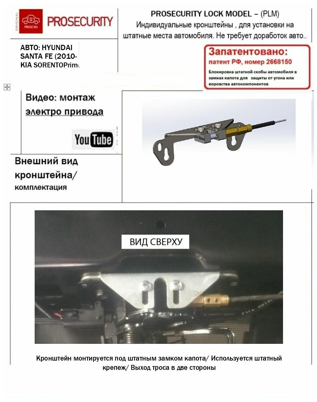 Механический замок капота для Hyundai Santa Fe (2015-2018), Mufasa, Kia Sorento Prime III (2014-2020), Carnival IV (2020-) PROSECURITY интересное: