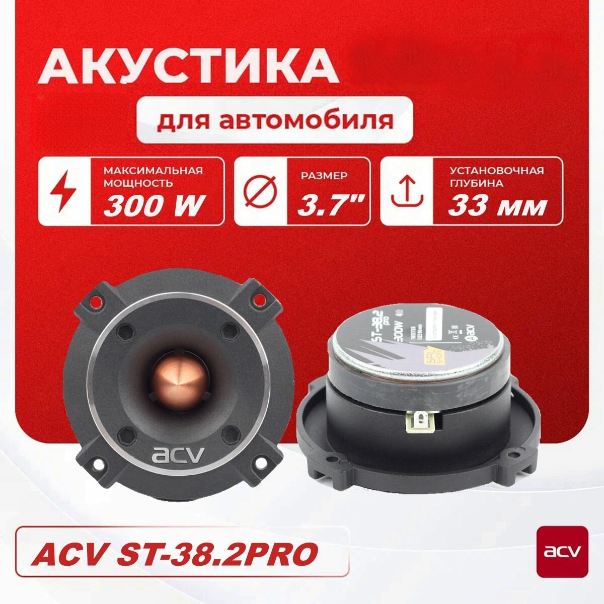 Ниже Вы можете прочитать отзывы на ВЧ динамик ACV ST-38.2 PRO SPL SHOW / Рупорный ВЧ динамик 10 см. (4 дюймa) / комплект 2 шт., ознакомится с подробными характеристиками, посмотреть интересные обзоры и фотографии на ВЧ динамик ACV ST-38.2 PRO SPL SHOW / Рупорный ВЧ динамик 10 см. (4 дюймa) / комплект 2 шт..