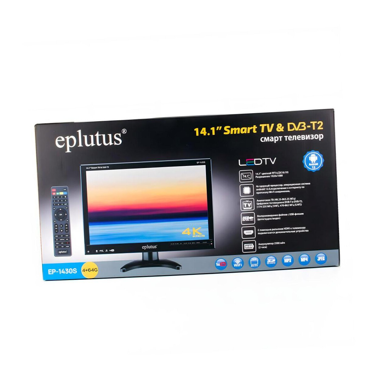 Купить Маленький умный ручной телевизор, смарт телевизор на Android 12 Eplutus Mod: EP-1430(S) 14" цветной TFT ЖК, черный. Встроенный аккумулятор 2500 m