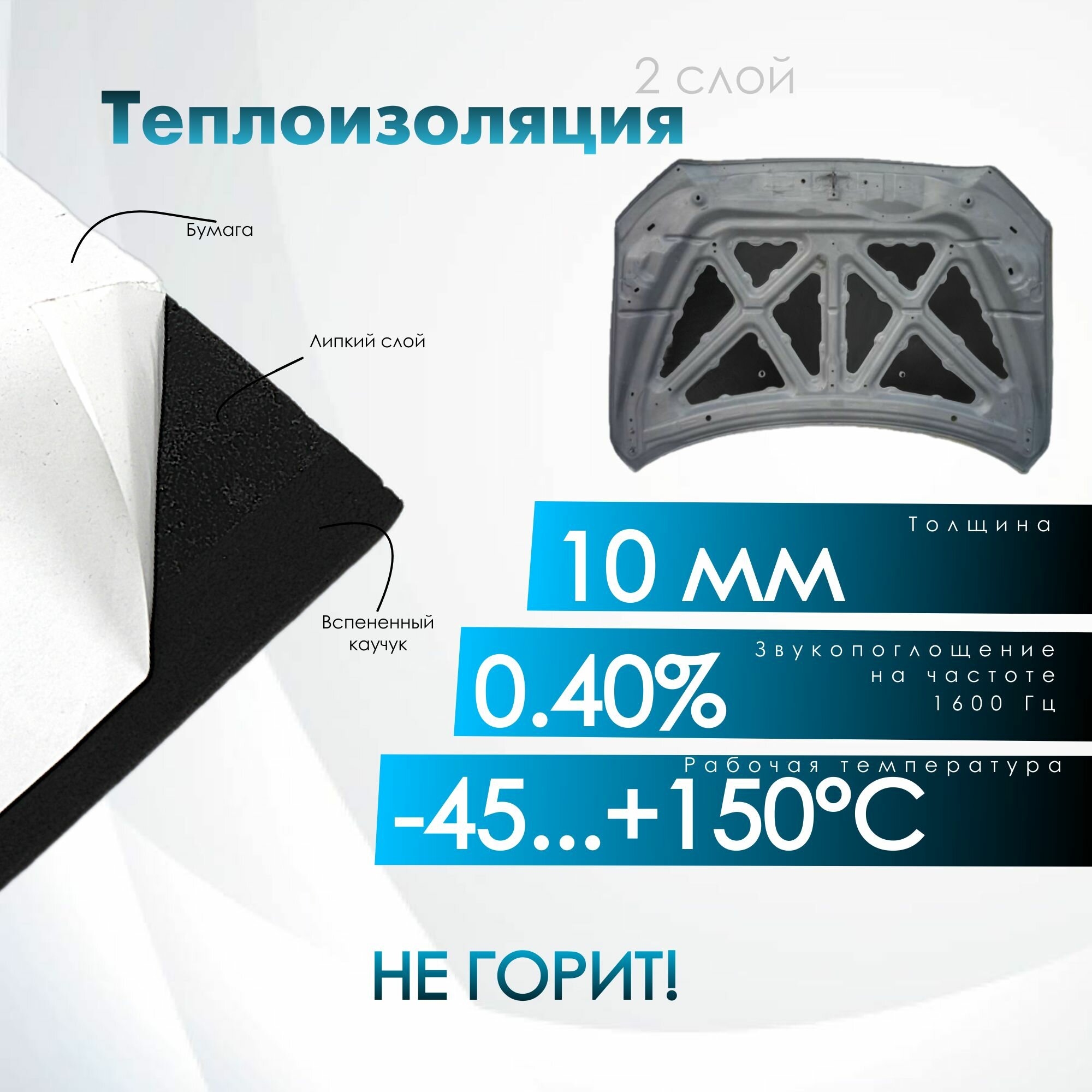 Комплект шумо и теплоизоляции капота Chery Tiggo 7 Pro Max T1E Лада X-cross 5 бутилкаучуковая основа с фольгой 2 мм вспененный каучук 10 мм