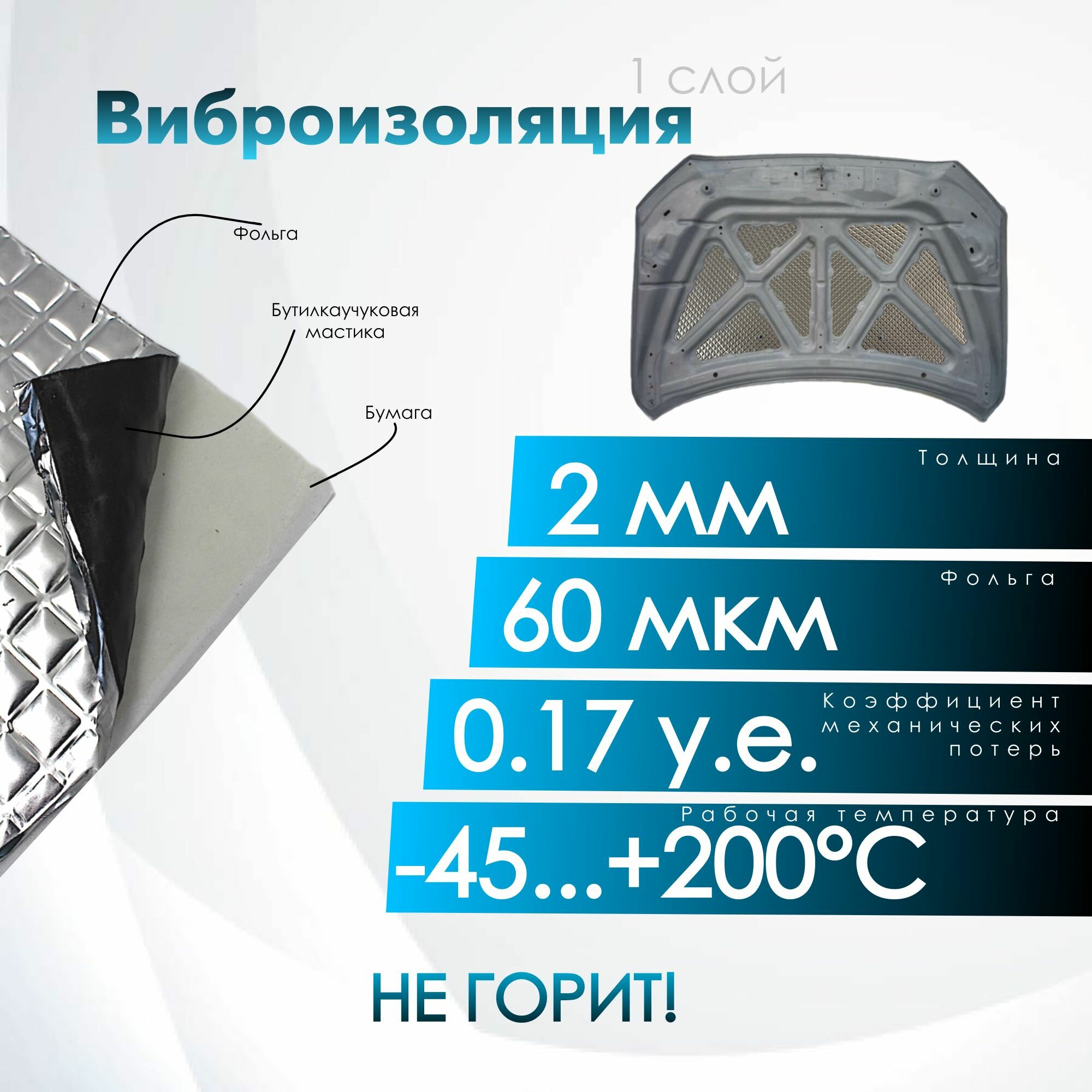 Комплект шумо и теплоизоляции капота Renault Logan 2 Sandero 2 бутилкаучуковая основа с фольгой 2 мм вспененный каучук