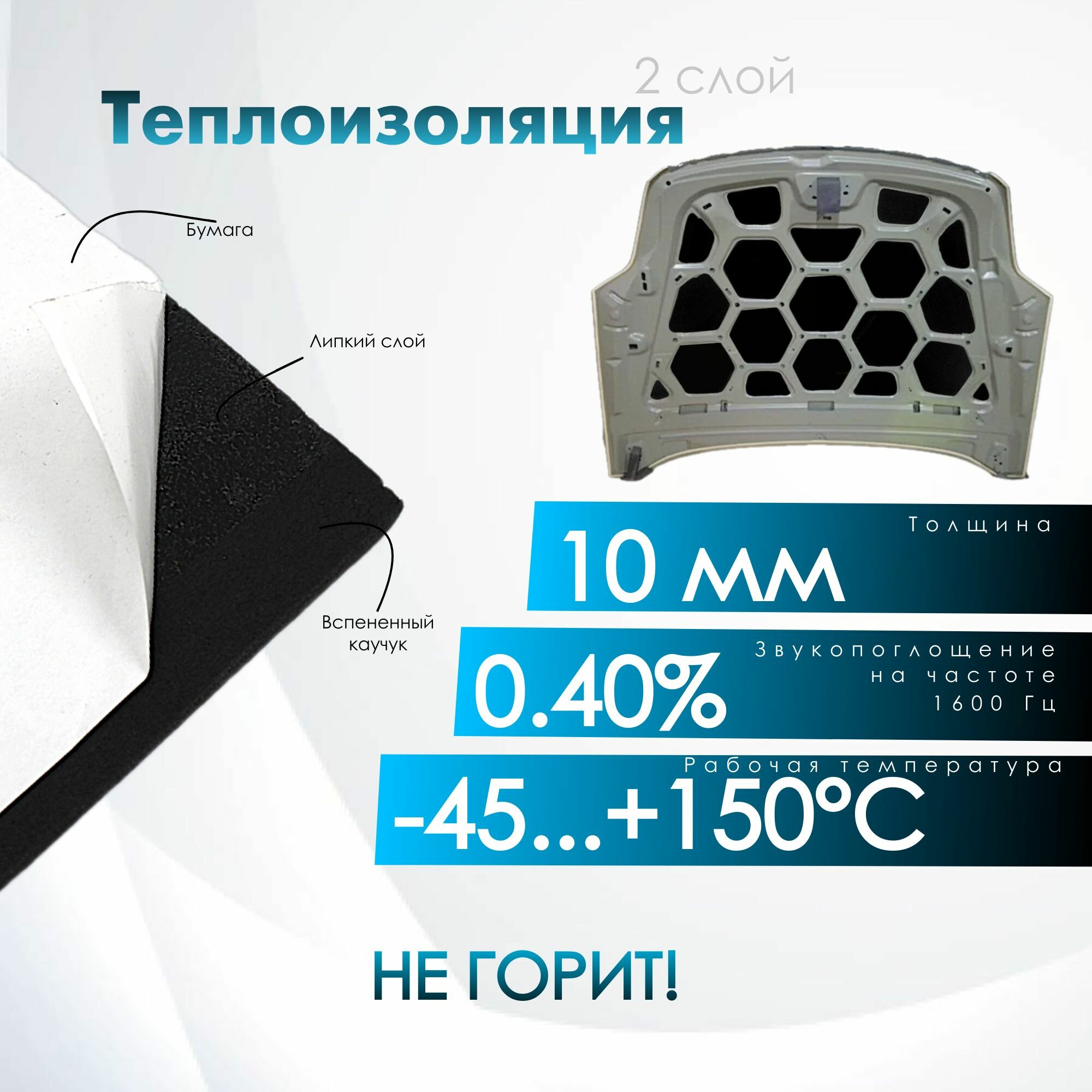 Комплект шумо и теплоизоляции капота Chery Tiggo 7 Pro Max T1E Лада X-cross 5 бутилкаучуковая основа с фольгой 2 мм вспененный каучук 10 мм