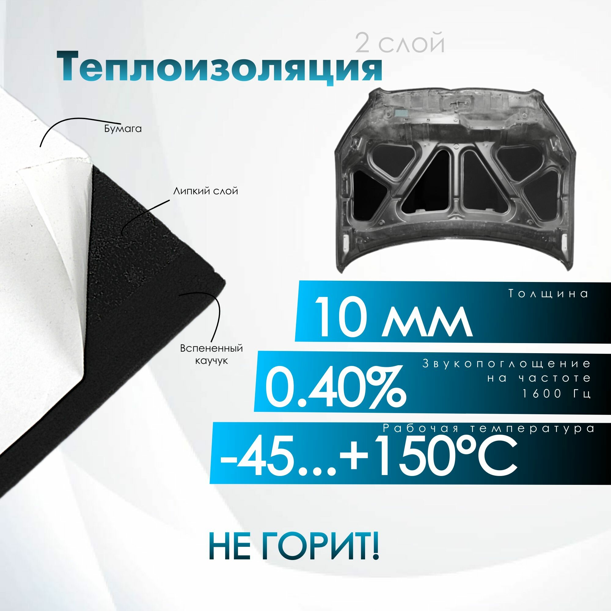Комплект шумо и теплоизоляции капота Chery Tiggo 7 Pro Max T1E Лада X-cross 5 бутилкаучуковая основа с фольгой 2 мм вспененный каучук 10 мм