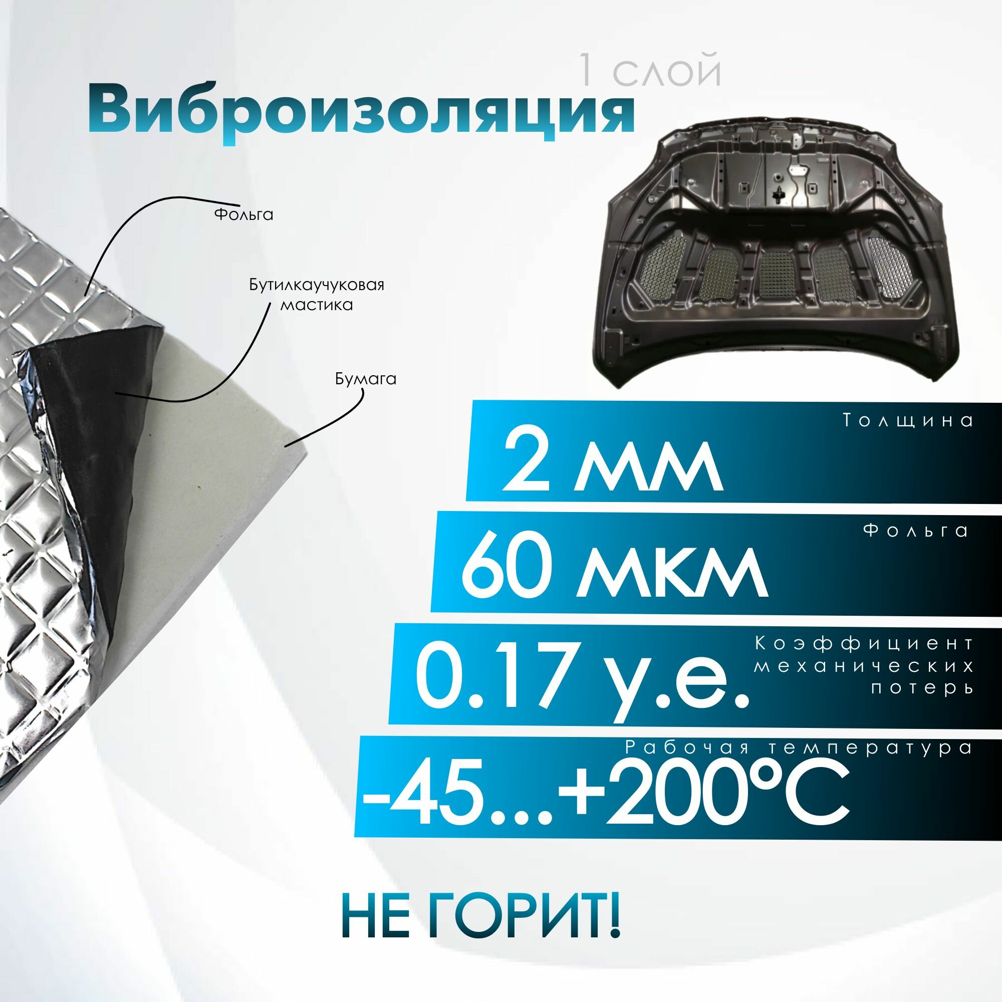 Комплект шумо и теплоизоляции капота Chevrolet Lanos Daewoo/ЗАЗ бутилкаучуковая основа с фольгой 2 мм вспененный каучук