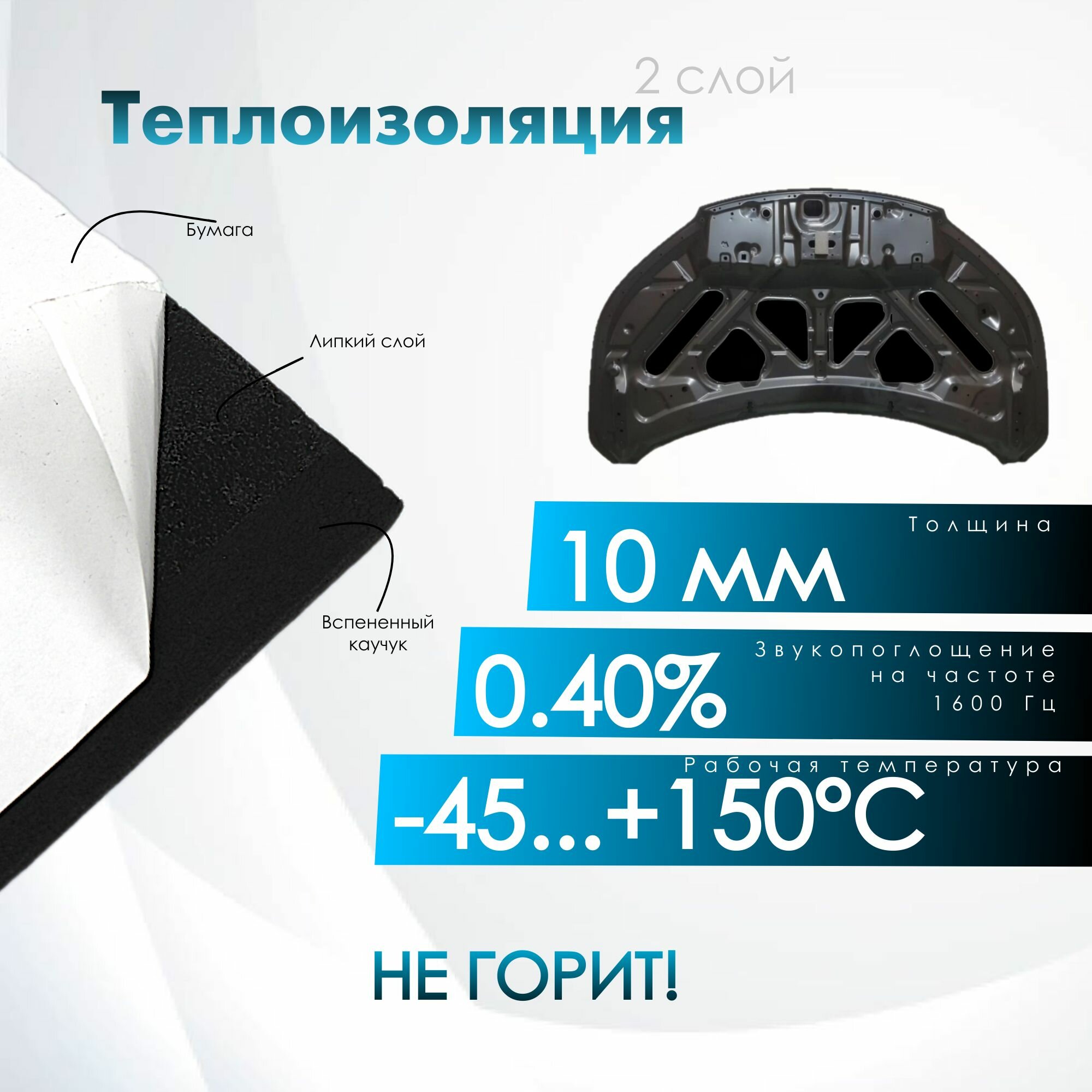 Комплект шумо и теплоизоляции капота Chery Tiggo 7 Pro Max T1E Лада X-cross 5 бутилкаучуковая основа с фольгой 2 мм вспененный каучук 10 мм
