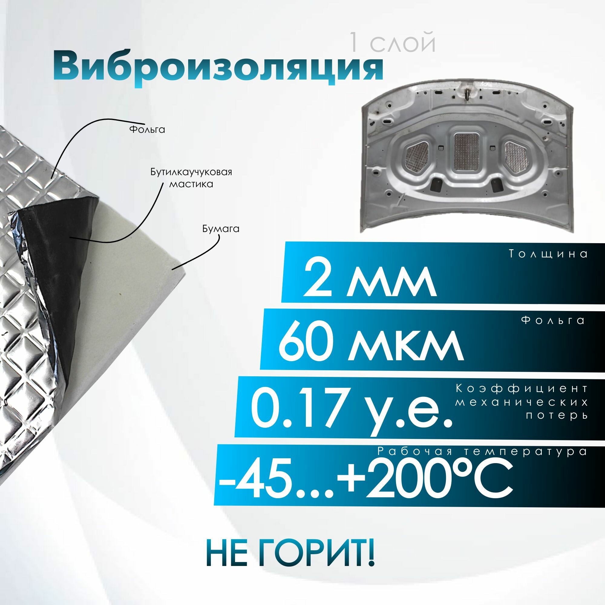 Комплект шумо и теплоизоляции капота Renault Logan 2 Sandero 2 бутилкаучуковая основа с фольгой 2 мм вспененный каучук