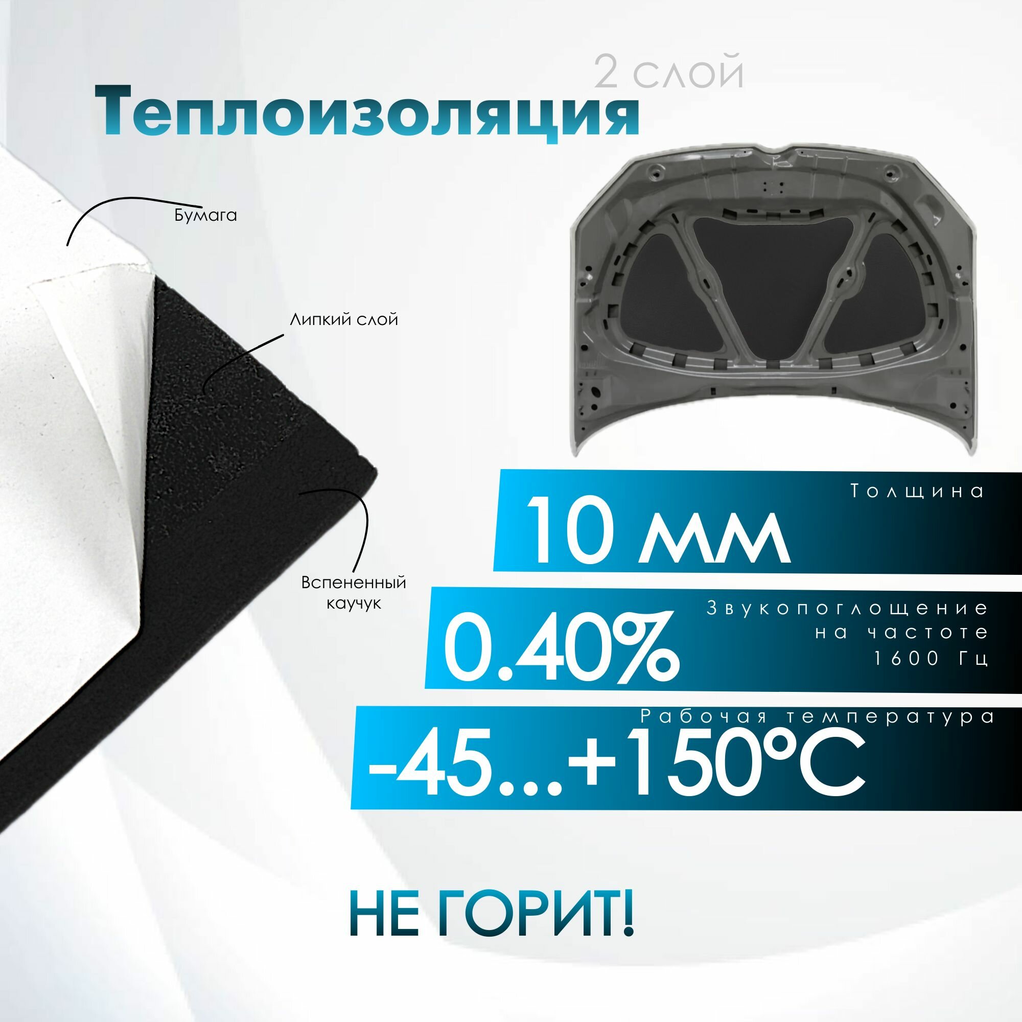Комплект шумо и теплоизоляции капота Chery Tiggo 7 Pro Max T1E Лада X-cross 5 бутилкаучуковая основа с фольгой 2 мм вспененный каучук 10 мм