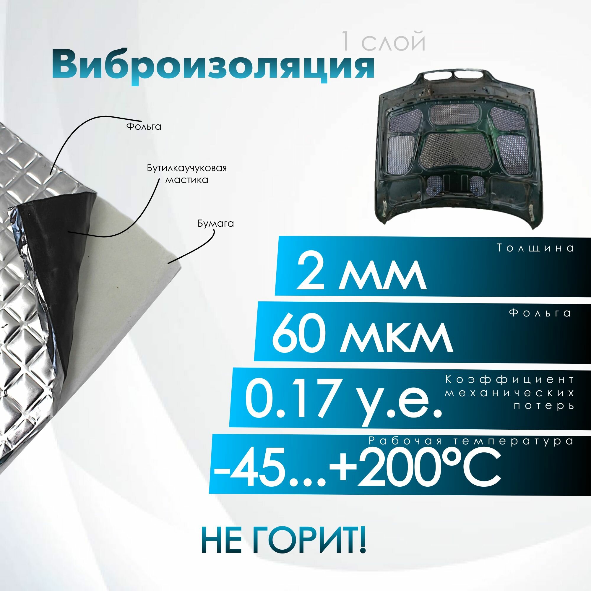 Комплект шумо и теплоизоляции капота Chevrolet Lanos Daewoo/ЗАЗ бутилкаучуковая основа с фольгой 2 мм вспененный каучук