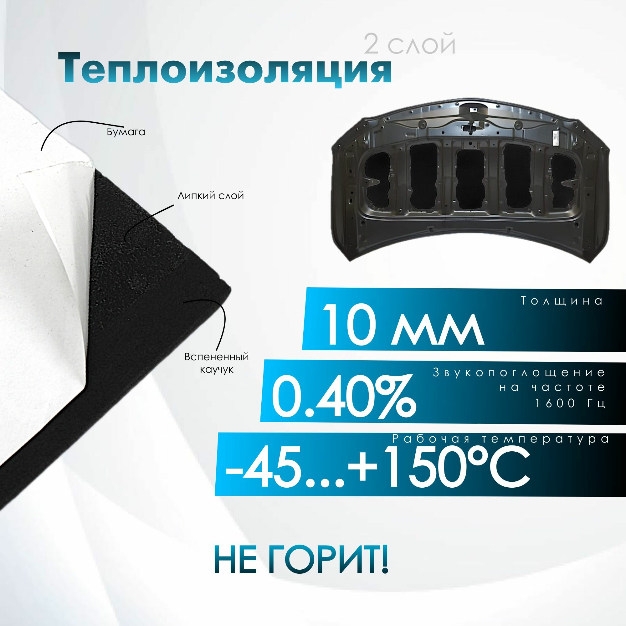 Комплект шумо и теплоизоляции капота Chery Tiggo 7 Pro Max T1E Лада X-cross 5 бутилкаучуковая основа с фольгой 2 мм вспененный каучук 10 мм