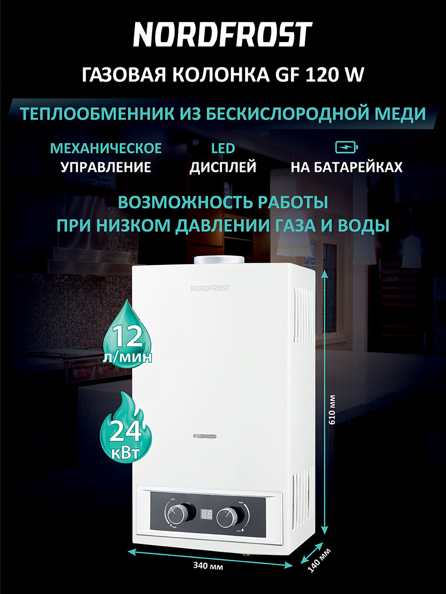 Водонагреватель газовый проточный NORDFROST GF 120 W с авторозжигом/колонка на 12 л/24 кВт, дымоход 110 мм, белый интересное: