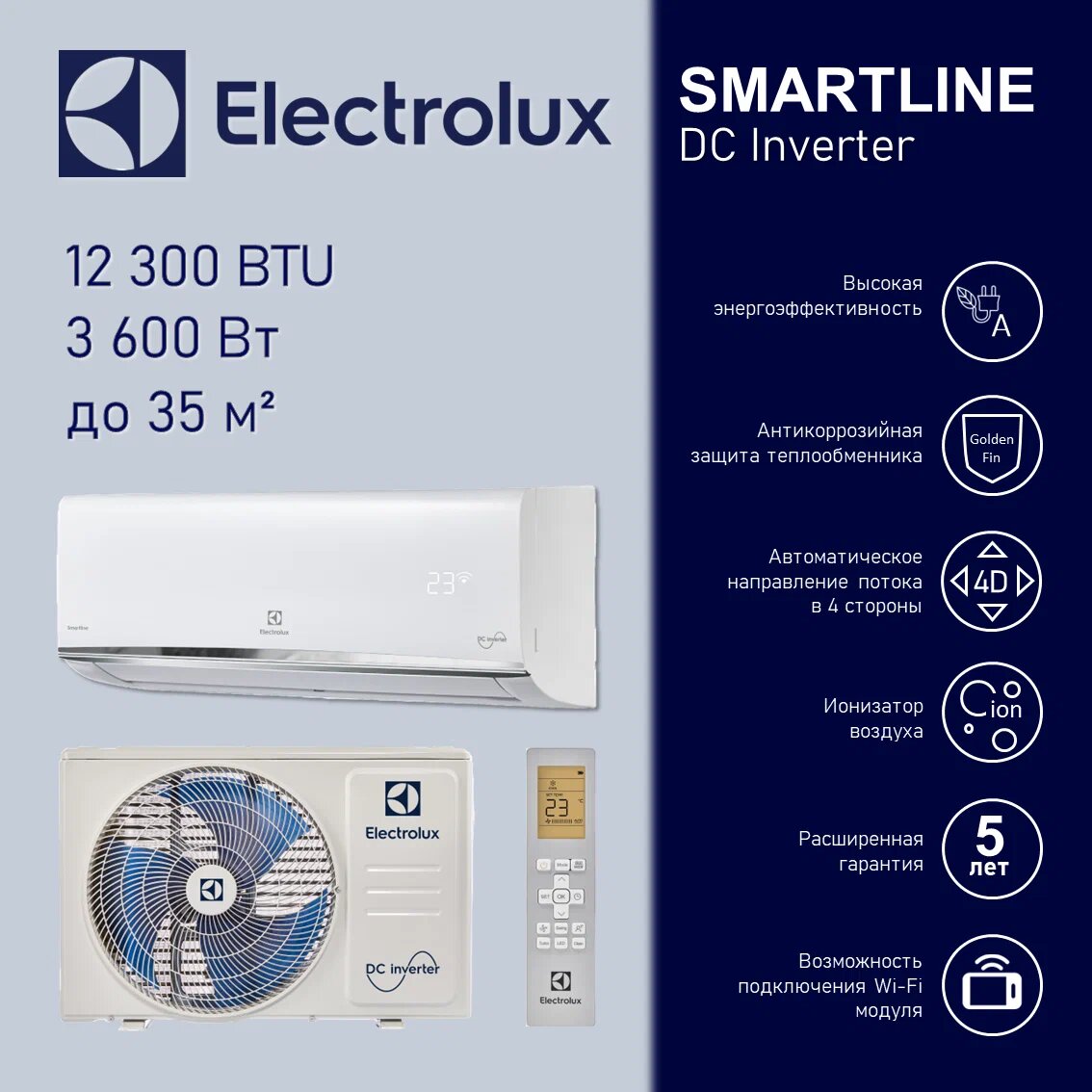 Сплит-система инверторного типа Electrolux Smartline EACS/I-12HSM/N8 на 35м², комплект интересное: