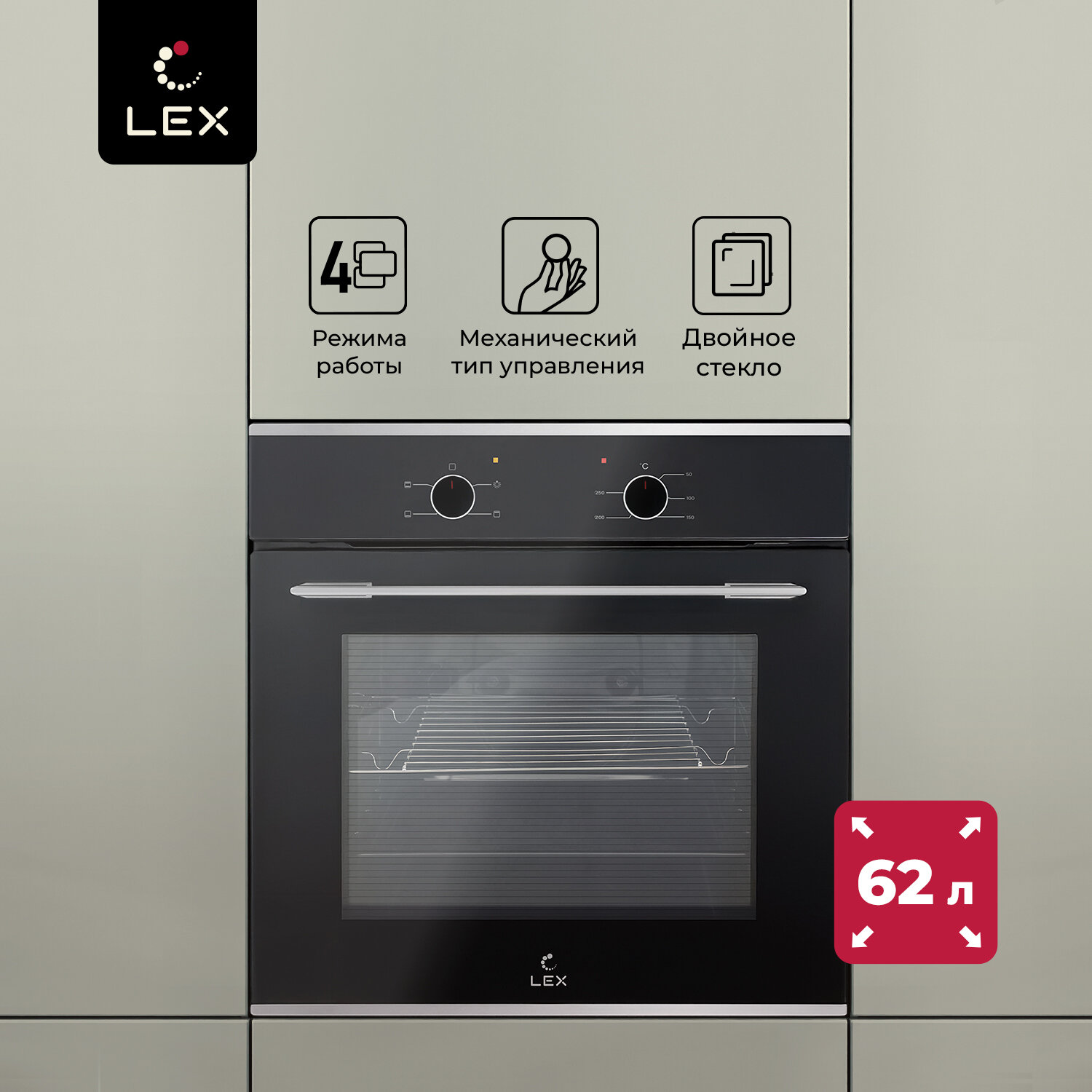 Духовой шкаф электрический встраиваемый LEX EDM 045 BL, Механические ручки, объем 62 л, 4 режима работы, двойное остекление дверцы, гарантия 36,6 мес. интересное: