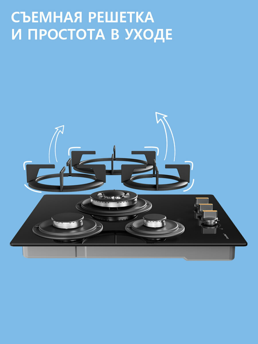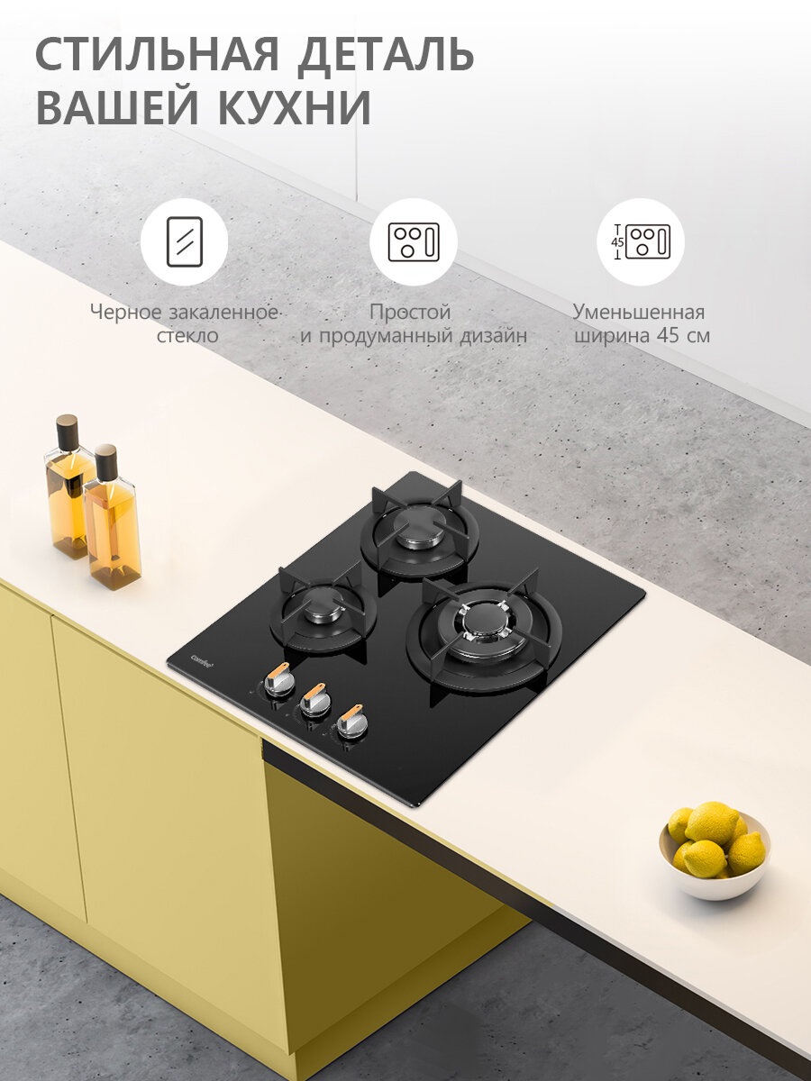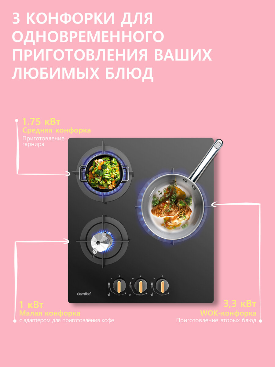 Газовая варочная панель Comfee CGH401GB, 45 см, 3 конфорки, WOK конфорка, электроподжиг, газ-контроль, закаленное стекло, черный интересное: