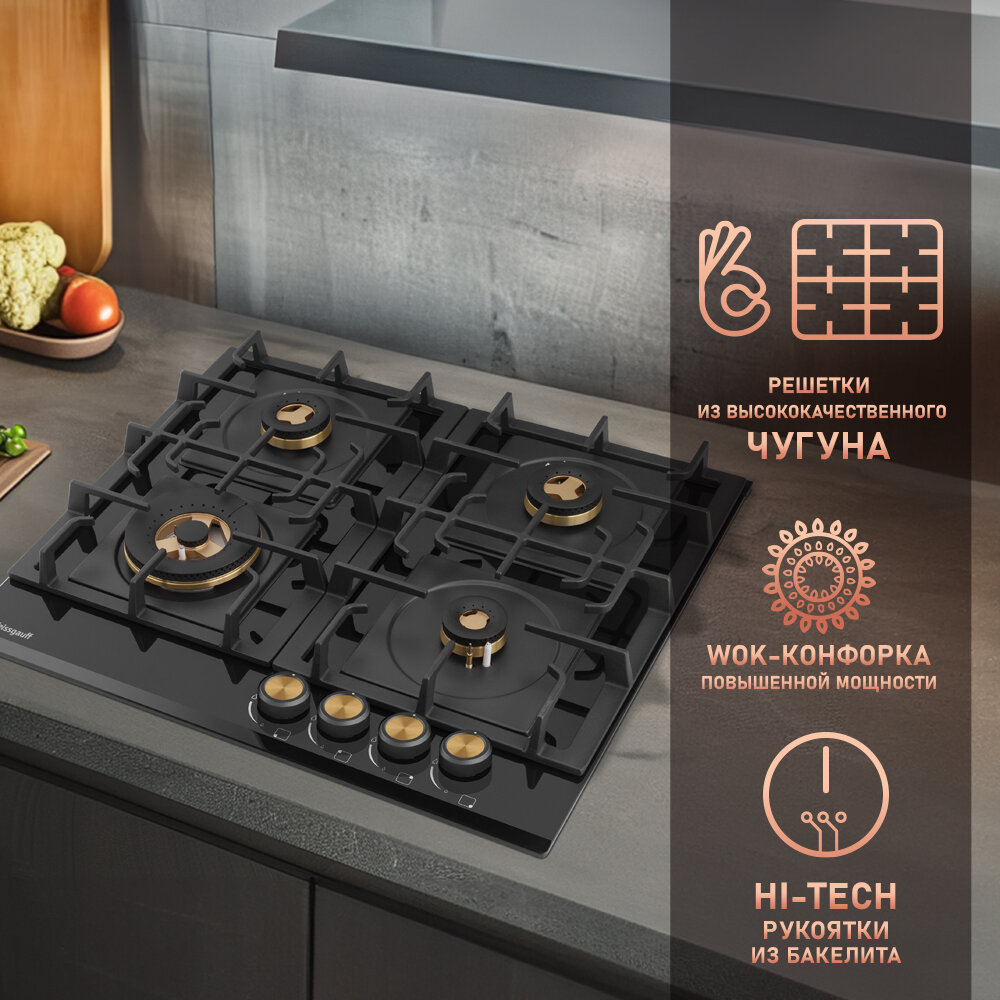 Варочная панель Weissgauff HGG 641 WGSV WOK-конфорка, Рукоятки Hi-Tech, газ-контроль