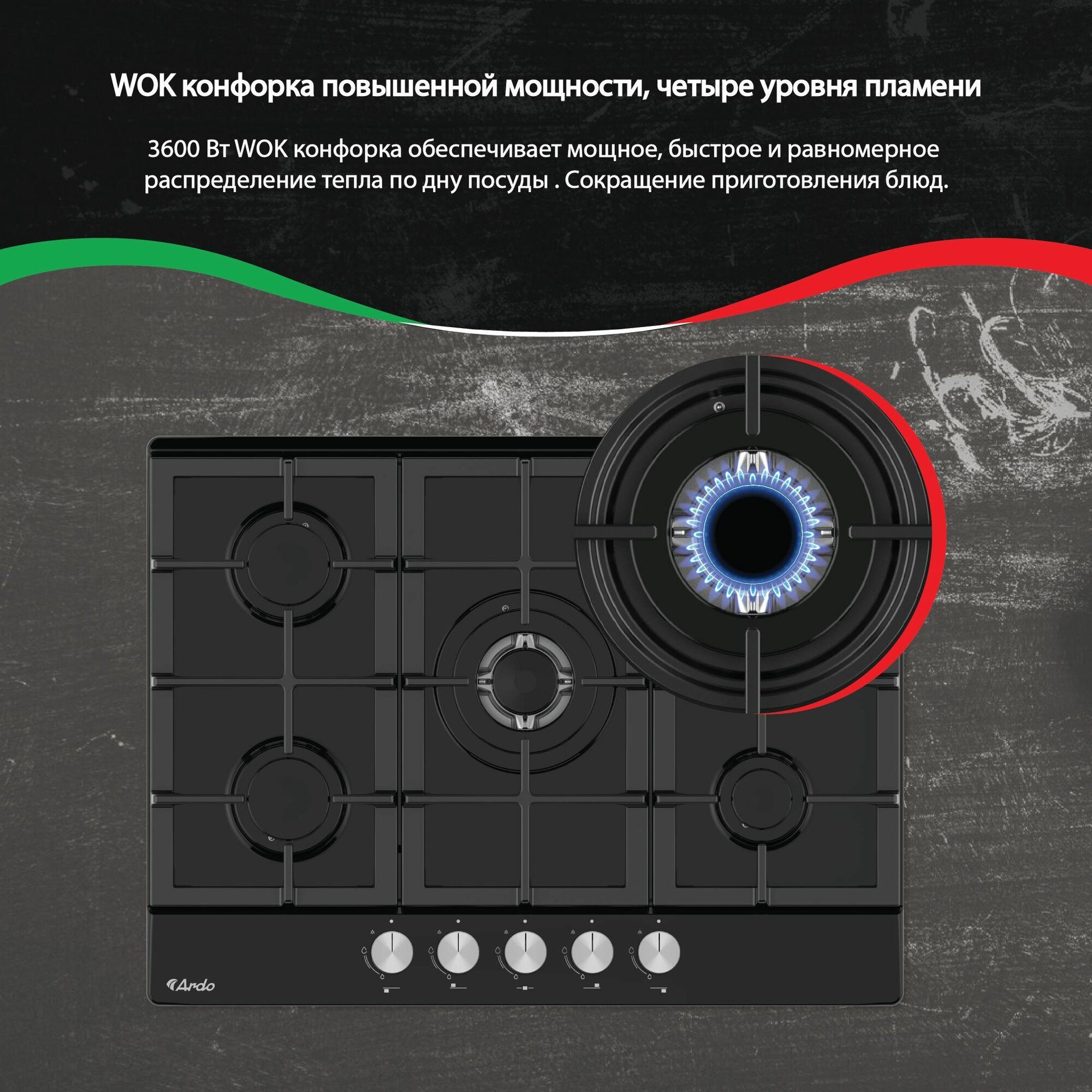 Купить Газовая варочная панель Ardo 70 см, черное закаленное стекло, WOK-конфорка, чугунные решетки, газ-контроль