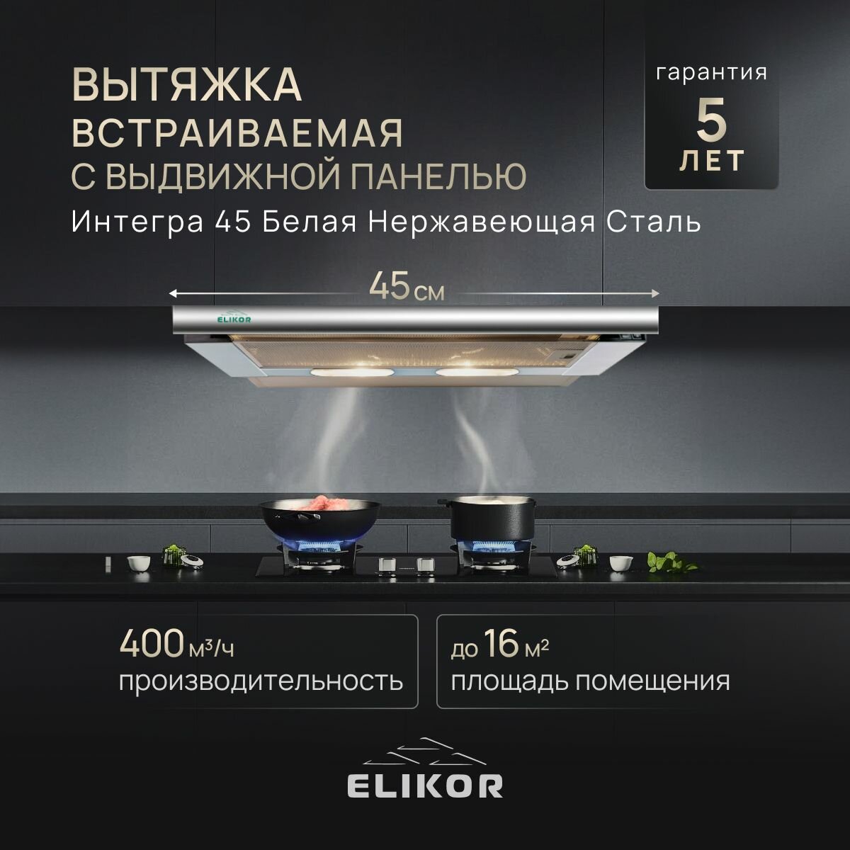 СохранитьВытяжка кухонная 45 см встраиваемая, 400 м3, цвет белый и нержавеющая сталь, ELIKOR Интегра 45П-400-В2Л, выдвижная 2 скорости, управление клавишное, 2 лампы накаливания интересное: