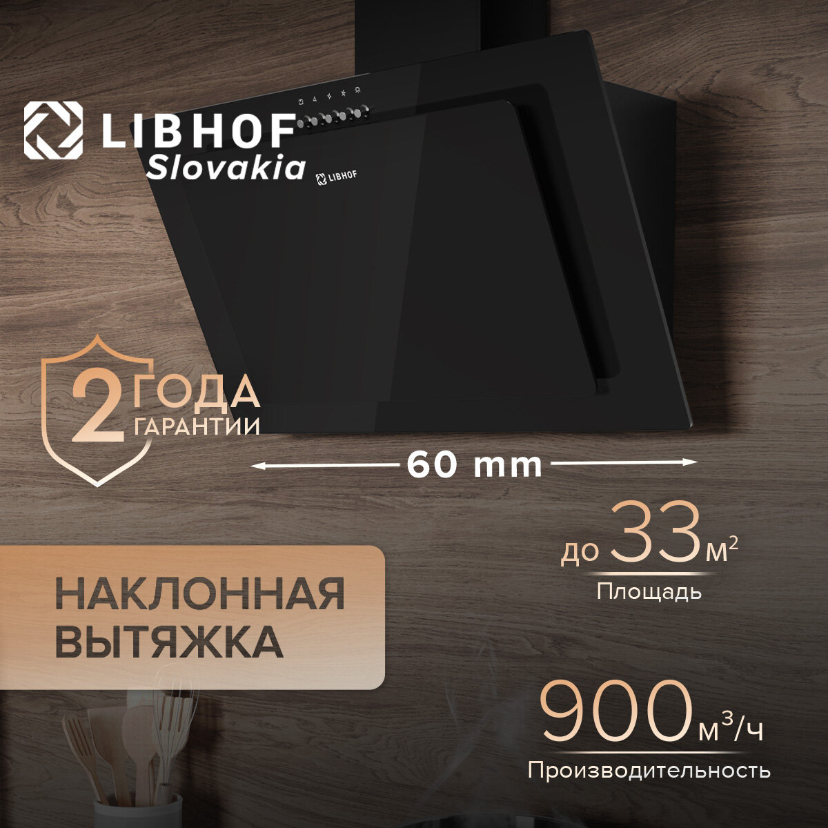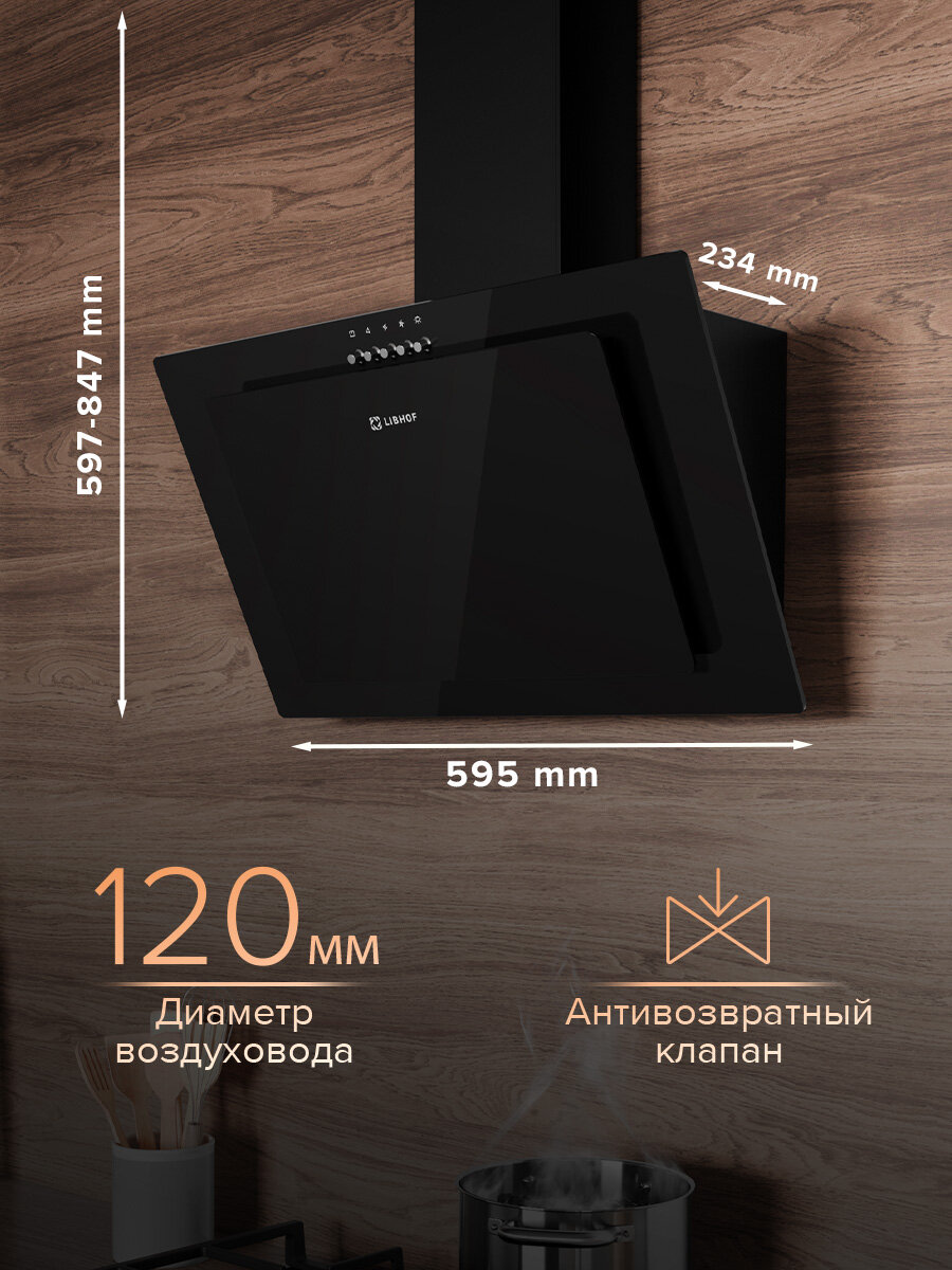 Вытяжка кухонная наклонная Libhof LV-6360 black / тройной алюминиевый жировой фильтр / механическое управление интересное: