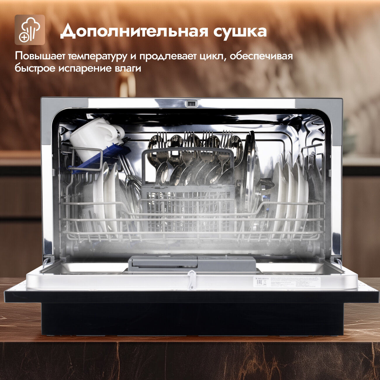 Компактная посудомоечная машина настольная DELVENTO VBP6701 / 6 комплектов / 7 программ / Active сушка / черный / класс А+ / половинная загрузка интересное: