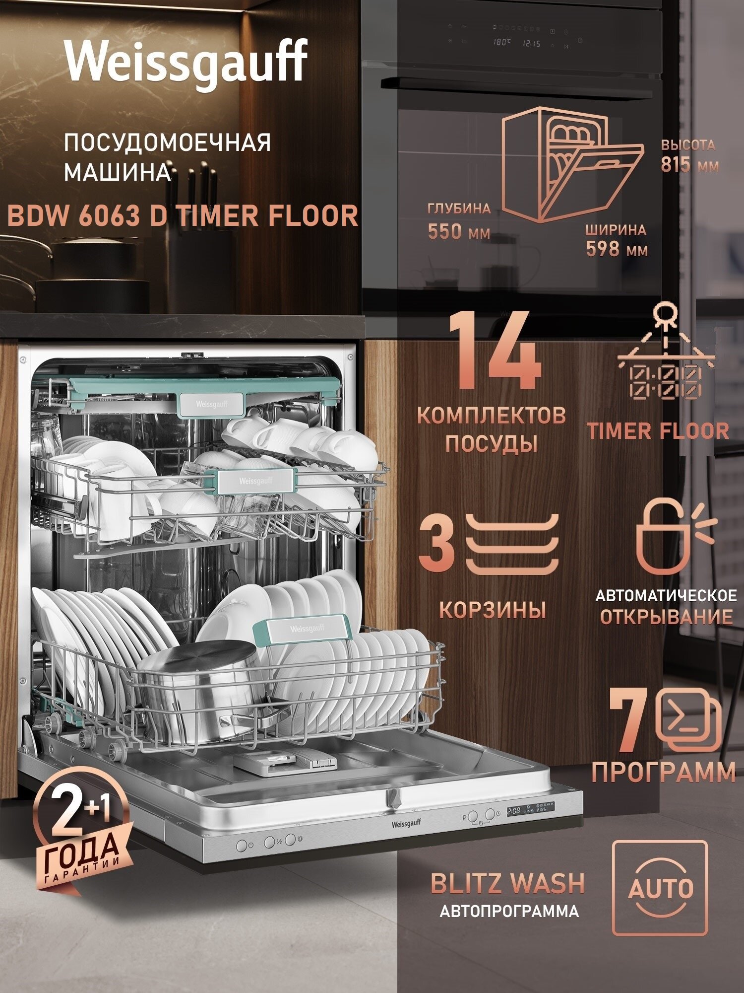 Ниже Вы можете прочитать отзывы на Встраиваемая посудомоечная машина с проекцией времени на полу и авто-открыванием Weissgauff BDW 6063 D Timer Floor, ознакомится с подробными характеристиками, посмотреть интересные обзоры и фотографии на Встраиваемая посудомоечная машина с проекцией времени на полу и авто-открыванием Weissgauff BDW 6063 D Timer Floor.