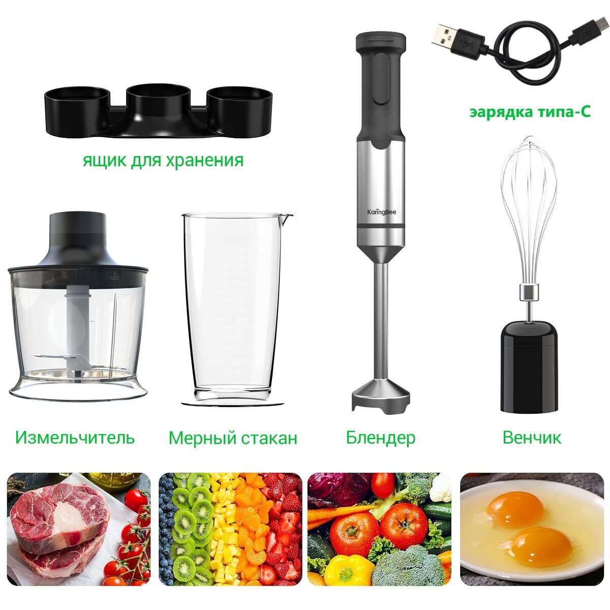 Блендер погружной KaringBee SF-HB1219, Беспроводная модель,5 насадки, режим турбо, защита двигателя интересное: