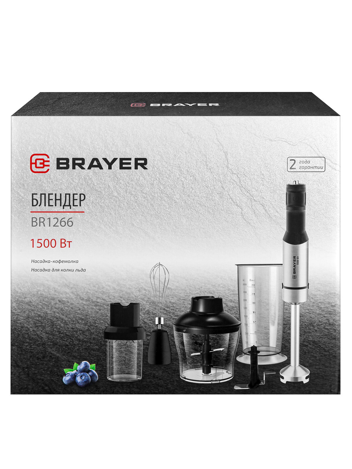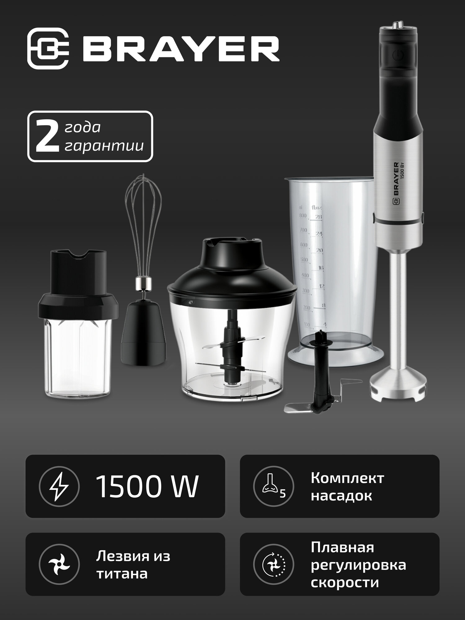 Блендер BRAYER BR1266, 1500 Вт, 5 скоростей, с венчиком, измельчителем, стаканом, лезвия из титана, черный интересное: