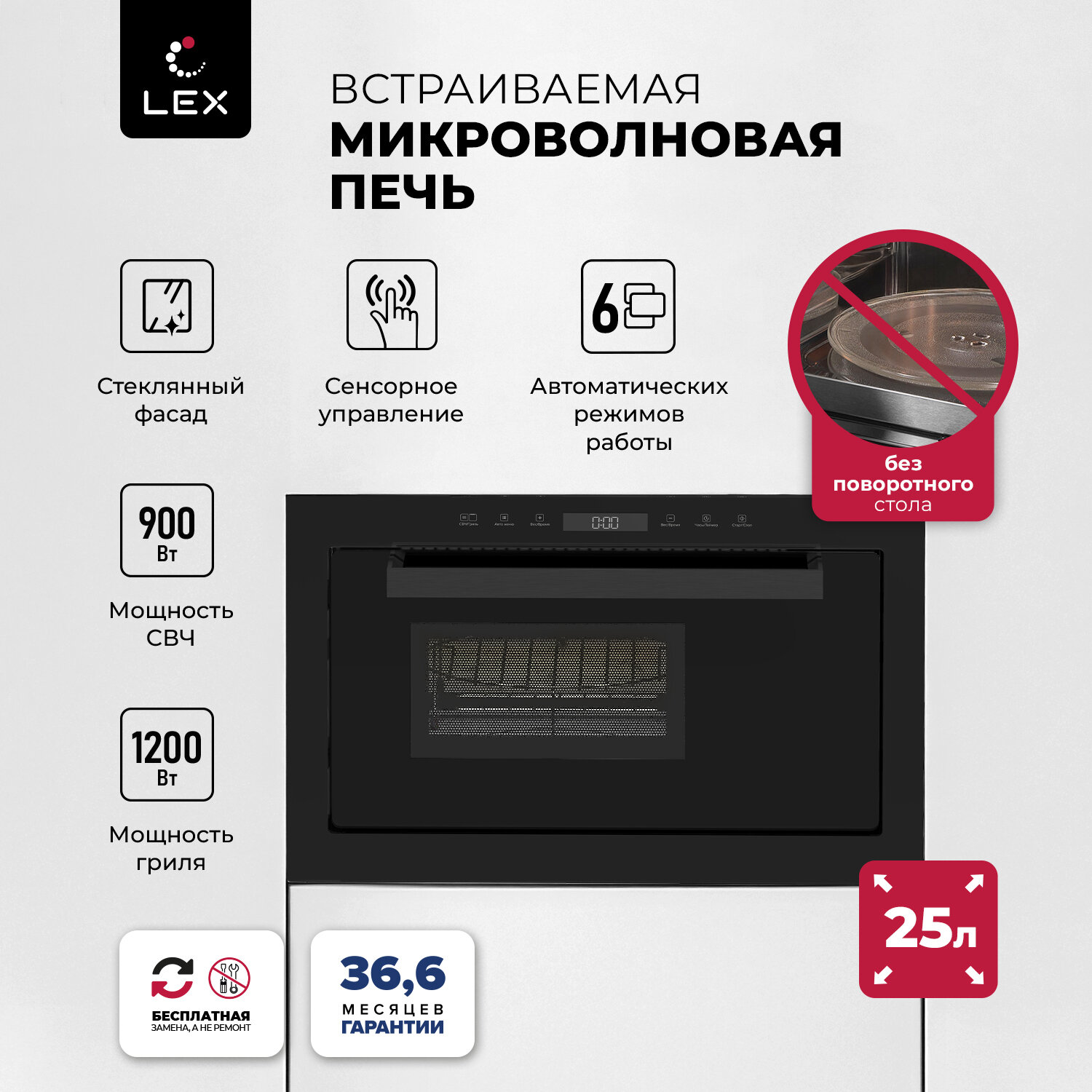 Микроволновая печь встраиваемая LEX BIMO 25.03 BL, сенсорное управление, объем: 25 л, таймер, разморозка, дисплей LED WHITE, часы, внутренняя подсветка камеры приготовления. интересное:
