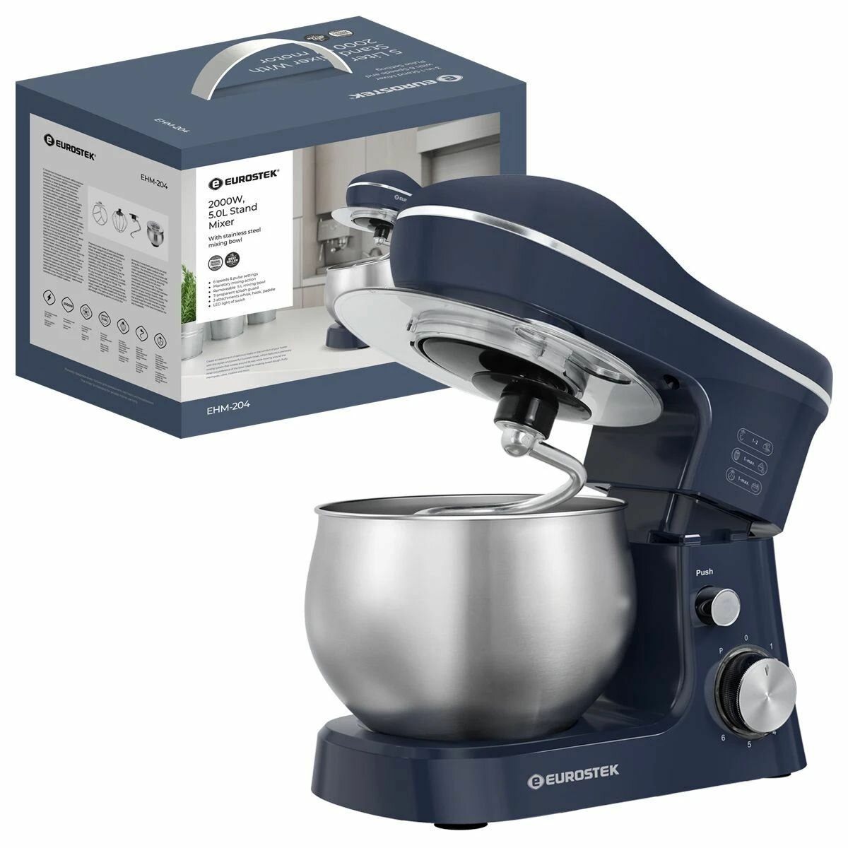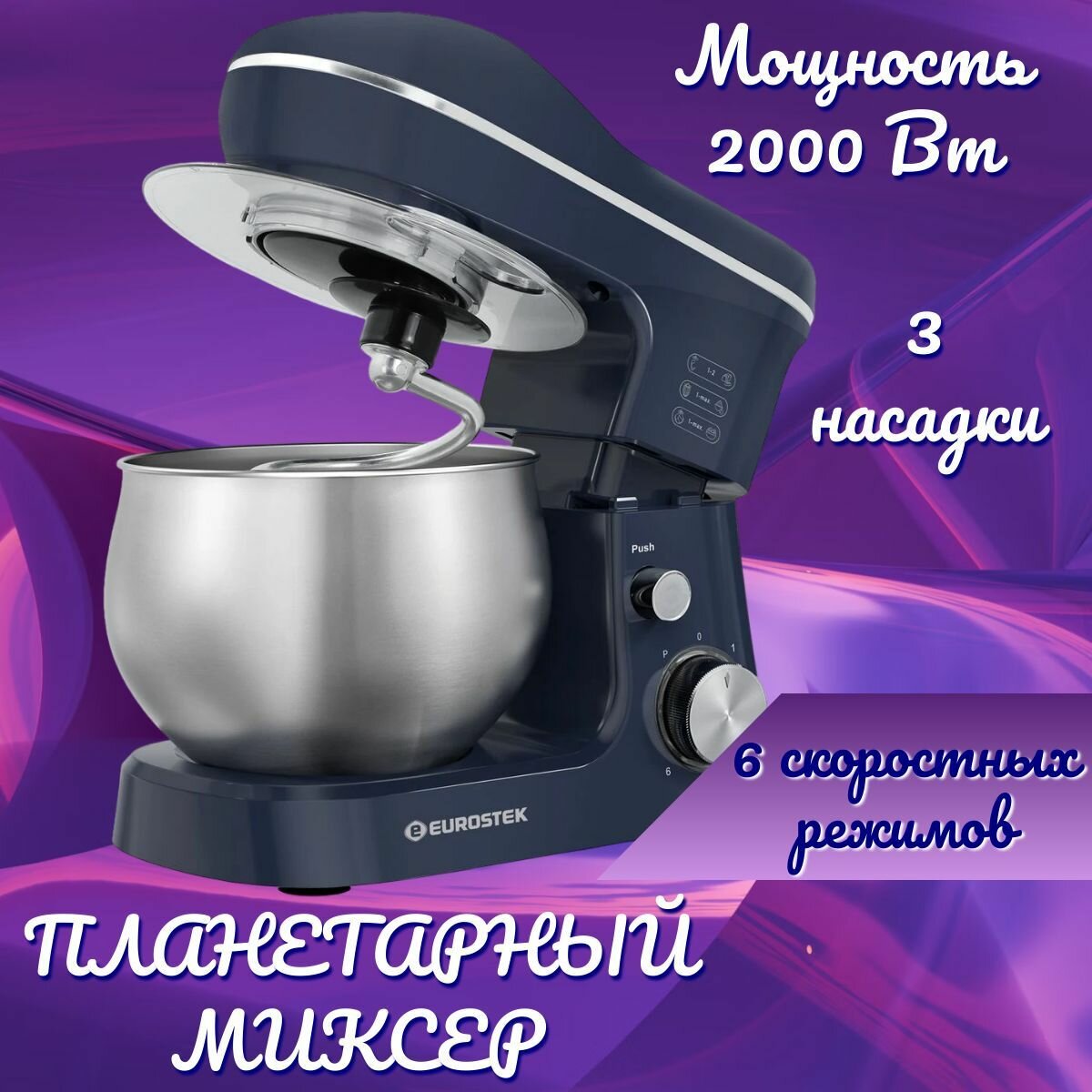 Планетарный миксер EUROSTEK EHM-204, синий, мощность 2000 Вт, турборежим интересное: