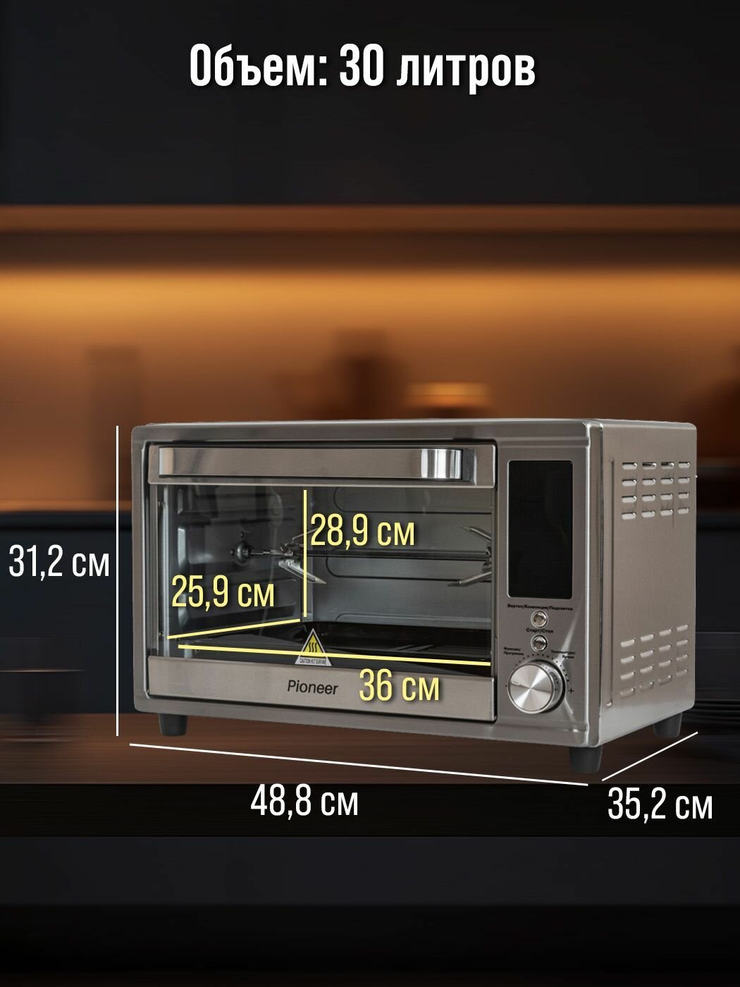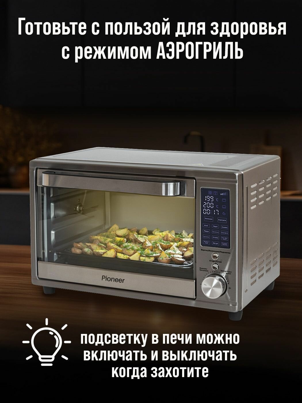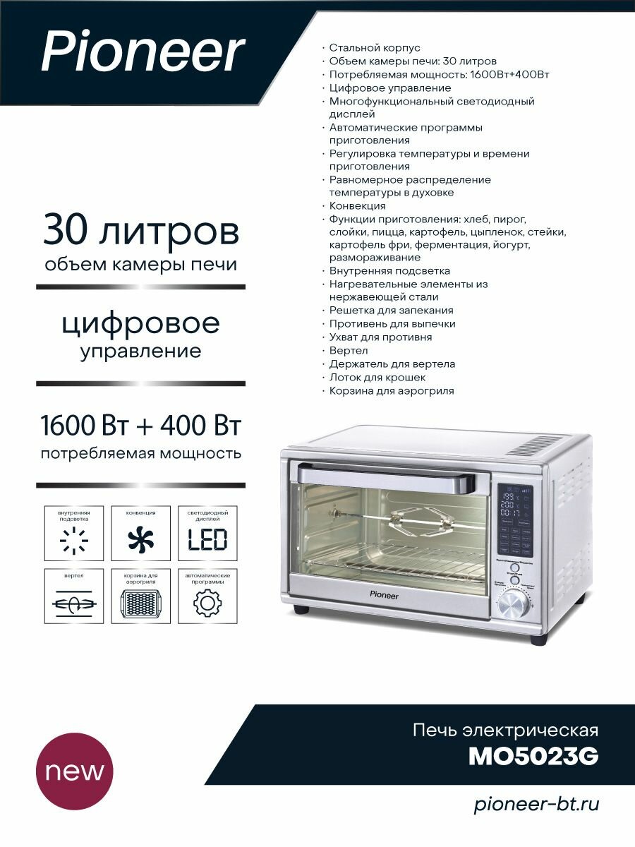Мини-печь 30 л с конвекцией и аэрогрилем Pioneer MO5023G, 12 автопрограмм, таймер, 2 года гарантии, 1600 + 400 Вт интересное: