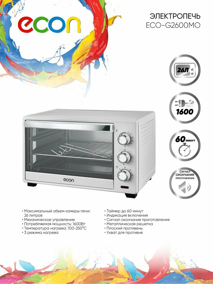 Мини печь электрическая духовка 26 л ECON ECO-G2600MO, 3 режима нагрева, таймер до 60 мин, сигнал окончания приготовления, 2 года гарантии,1600 Вт интересное:
