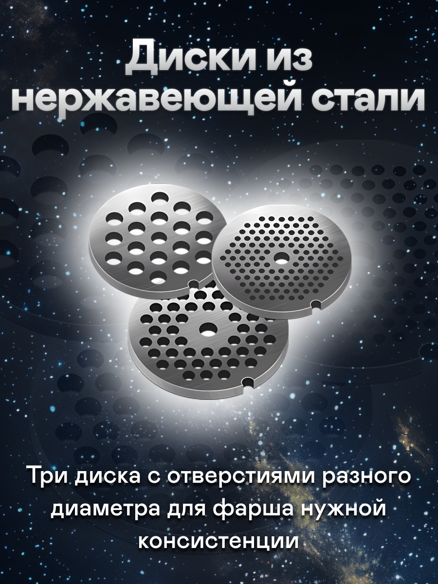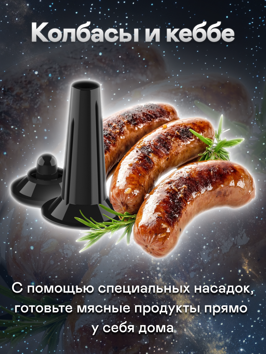 | Плюсы: | Выглядит стильно. В наборе есть все необходимое - толкатель, три разные решетки, приспособления для колбас.