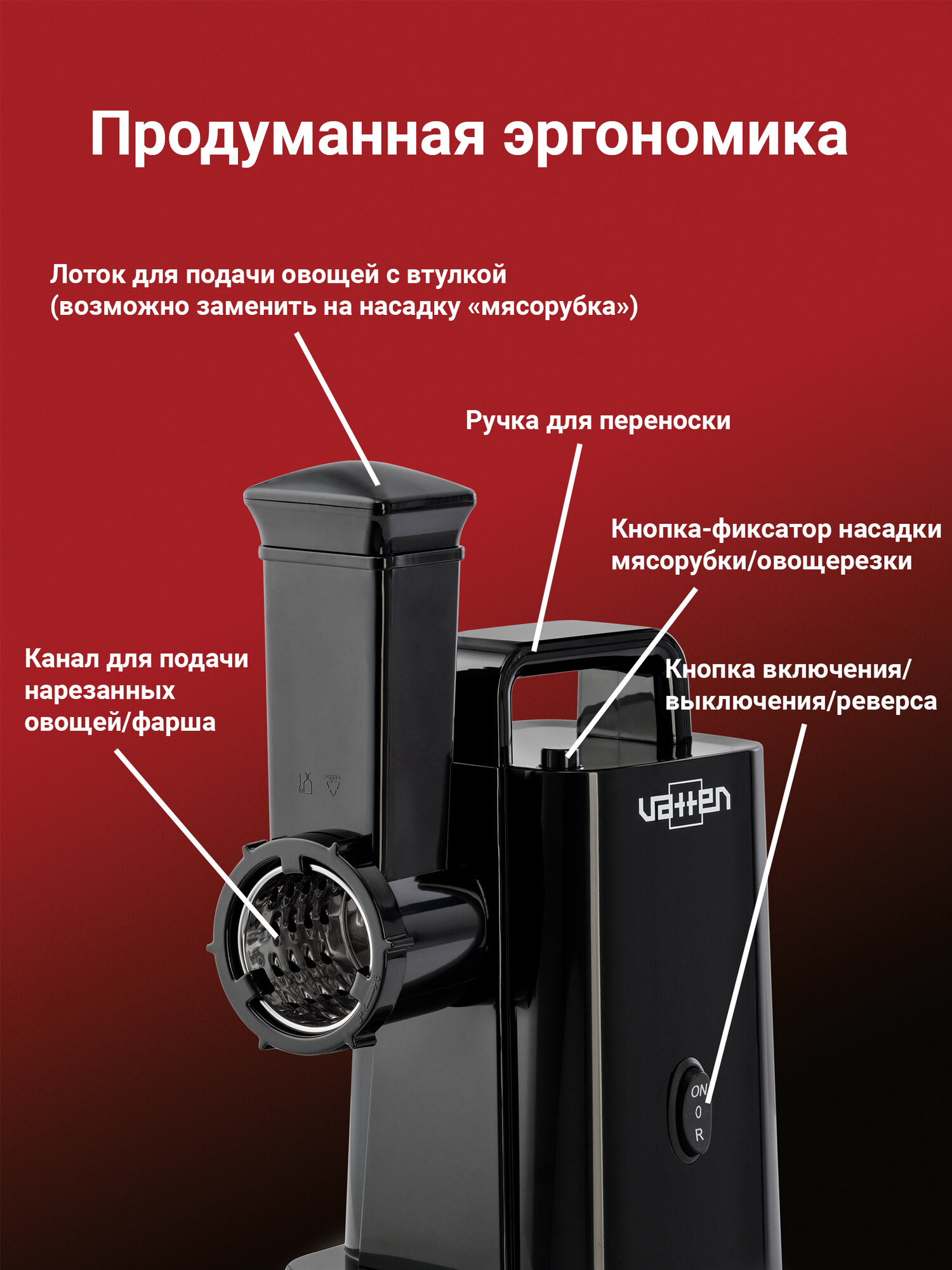 Мясорубка 2 в 1 VATTEN VG25/800/N, комплект овощерезки, черная интересное: