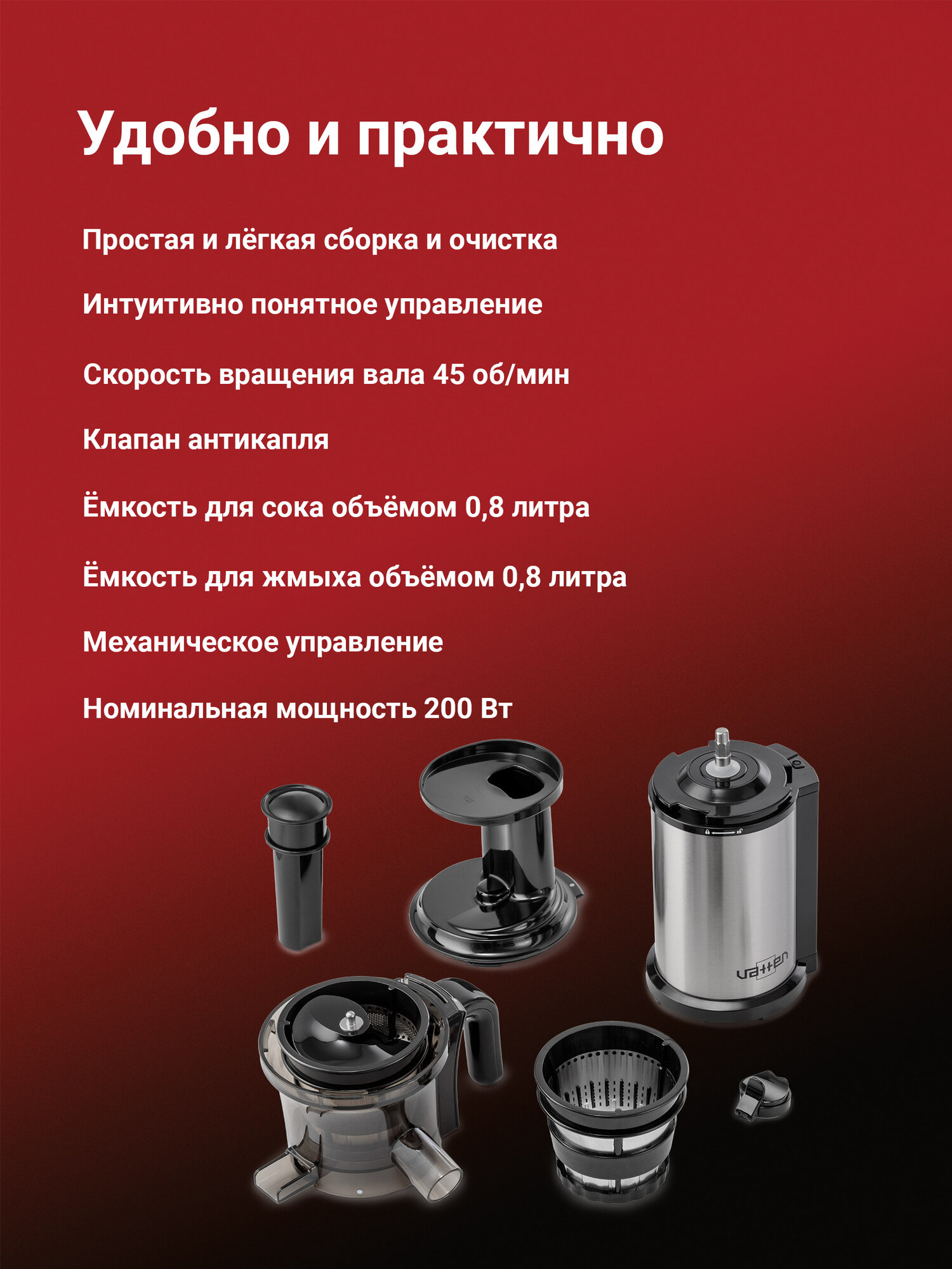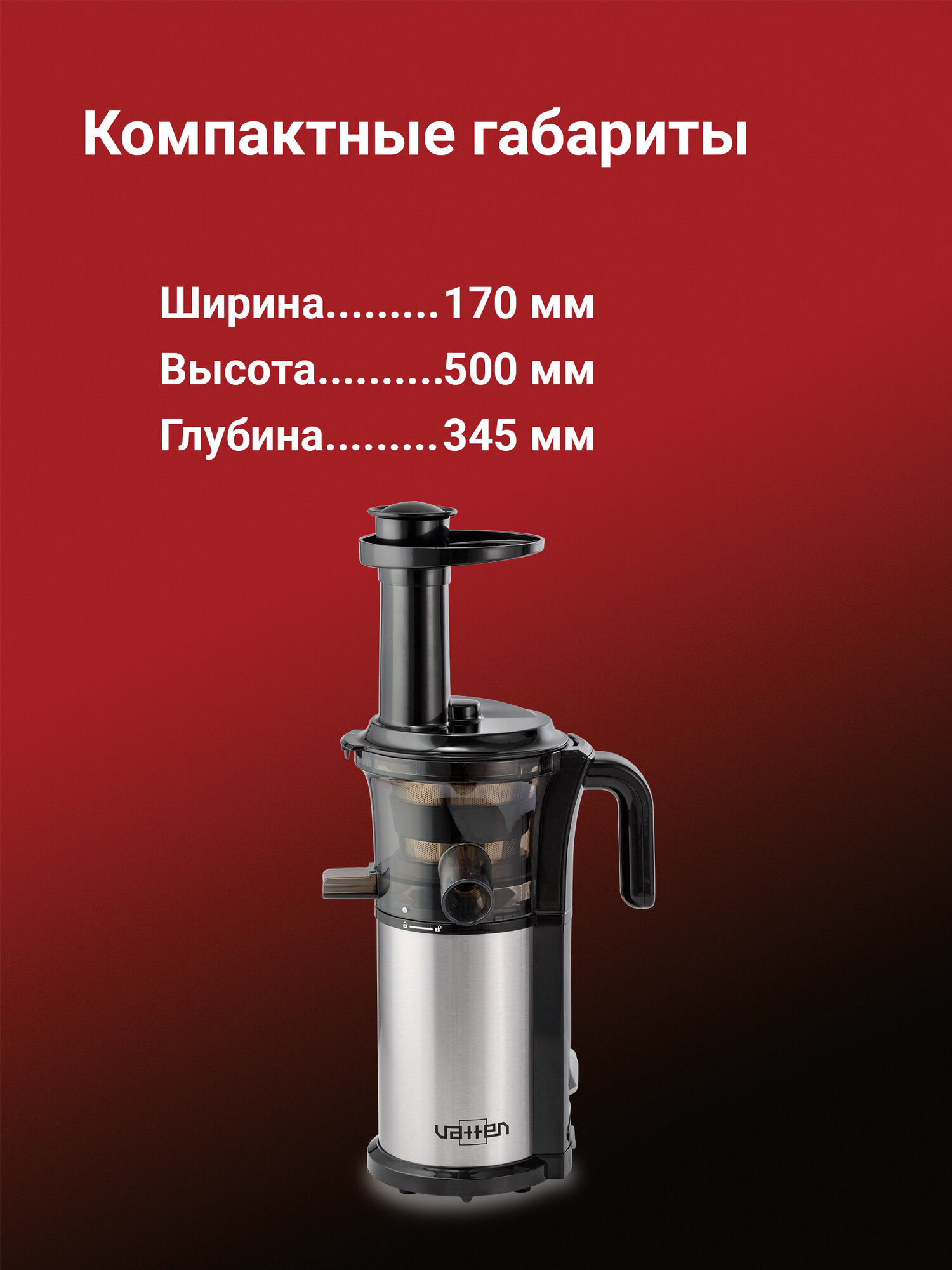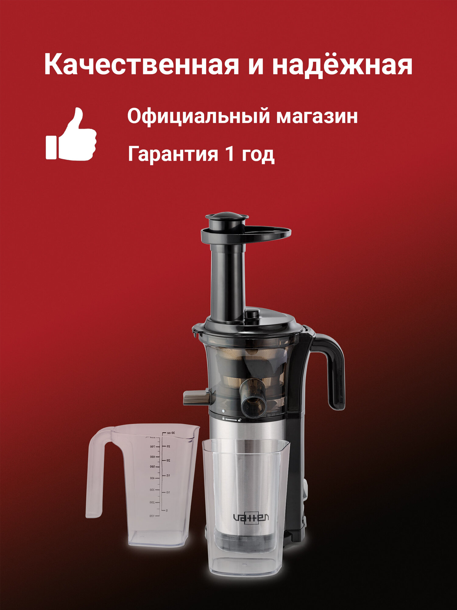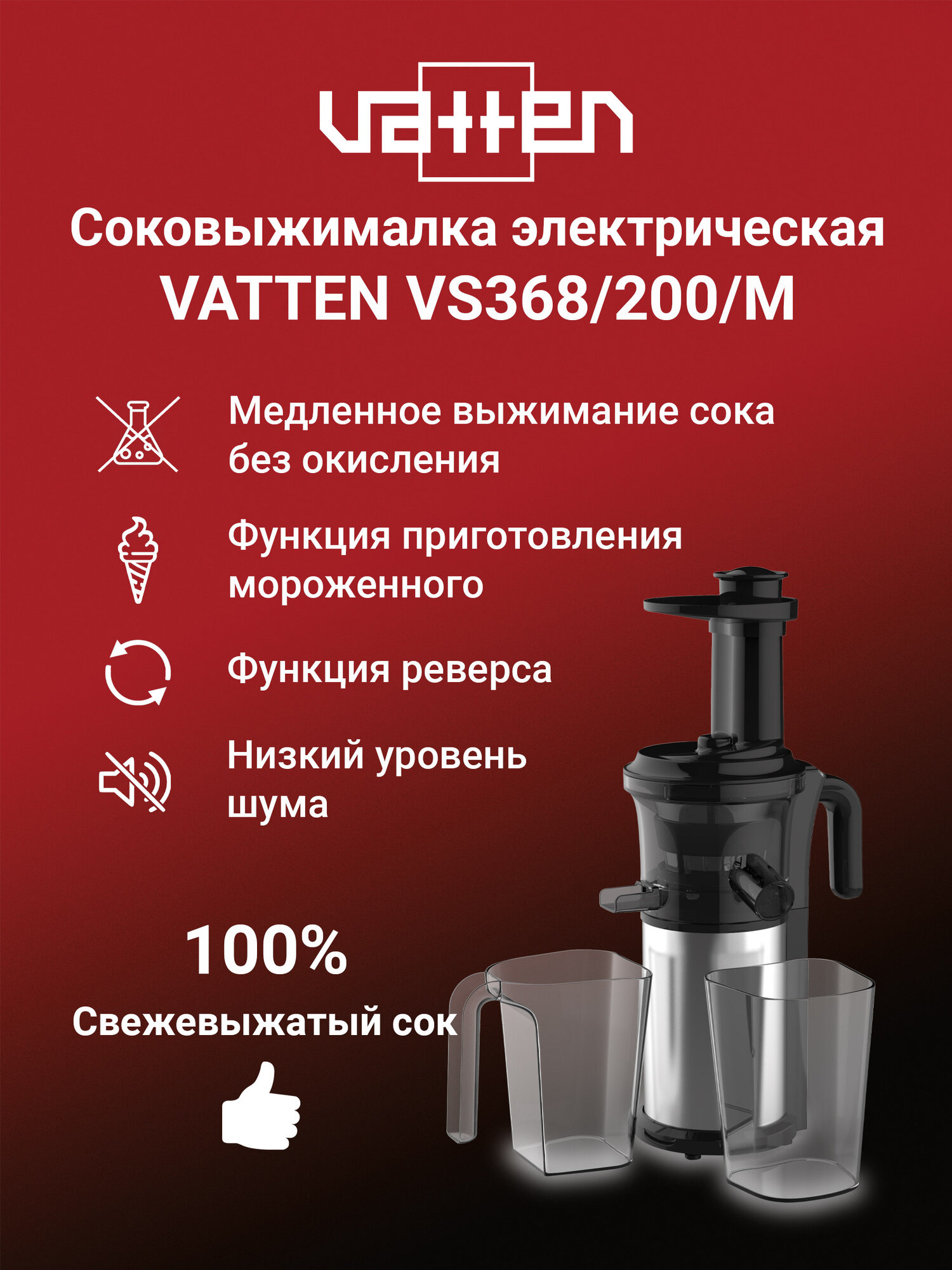 Соковыжималка VATTEN VS368/200/M медленный отжим 45 оборотов в минуту, 200 Вт интересное: