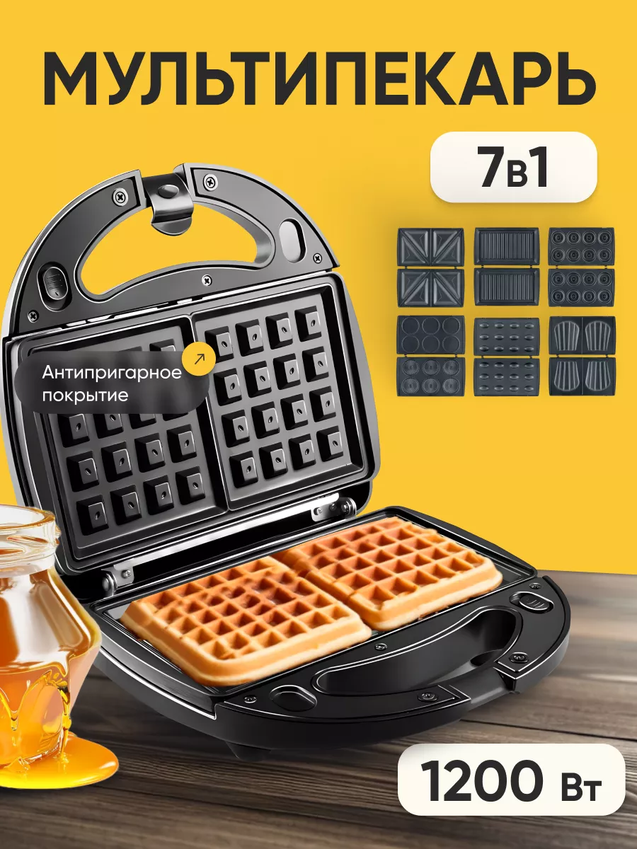 Мультипекарь для приготовления вафель, Вафельница, сендвичница электрическая, орешница, гриль, 7 в 1, индикатор нагрева,750Вт, черный интересное: