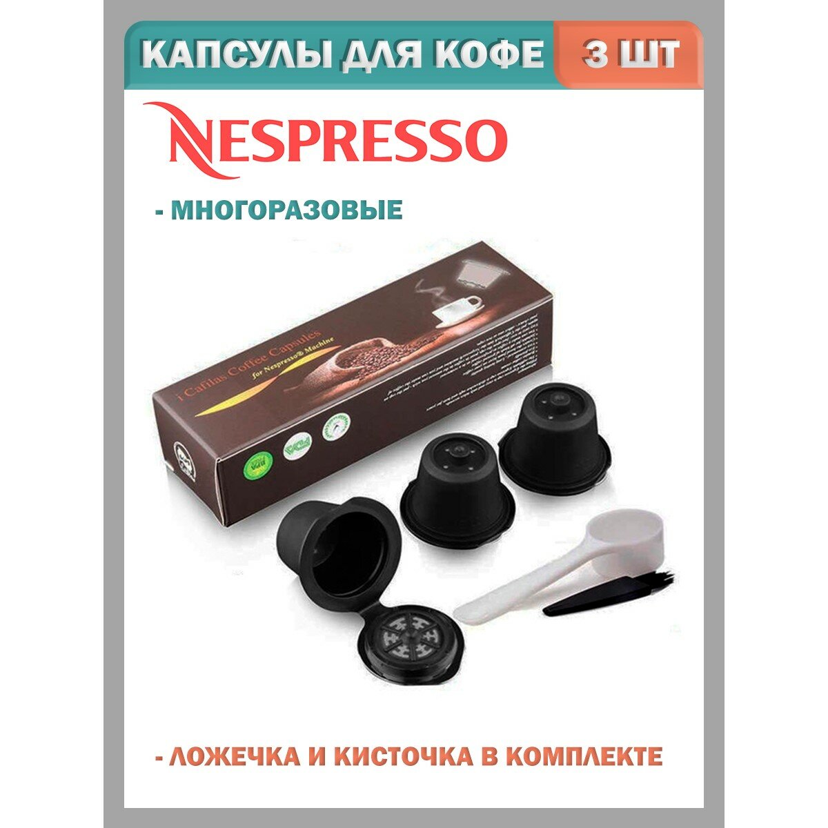 Купить Капсулы для кофемашины Espresso многоразовые набор из 3 штук с мерной ложкой и щеткой, пластик