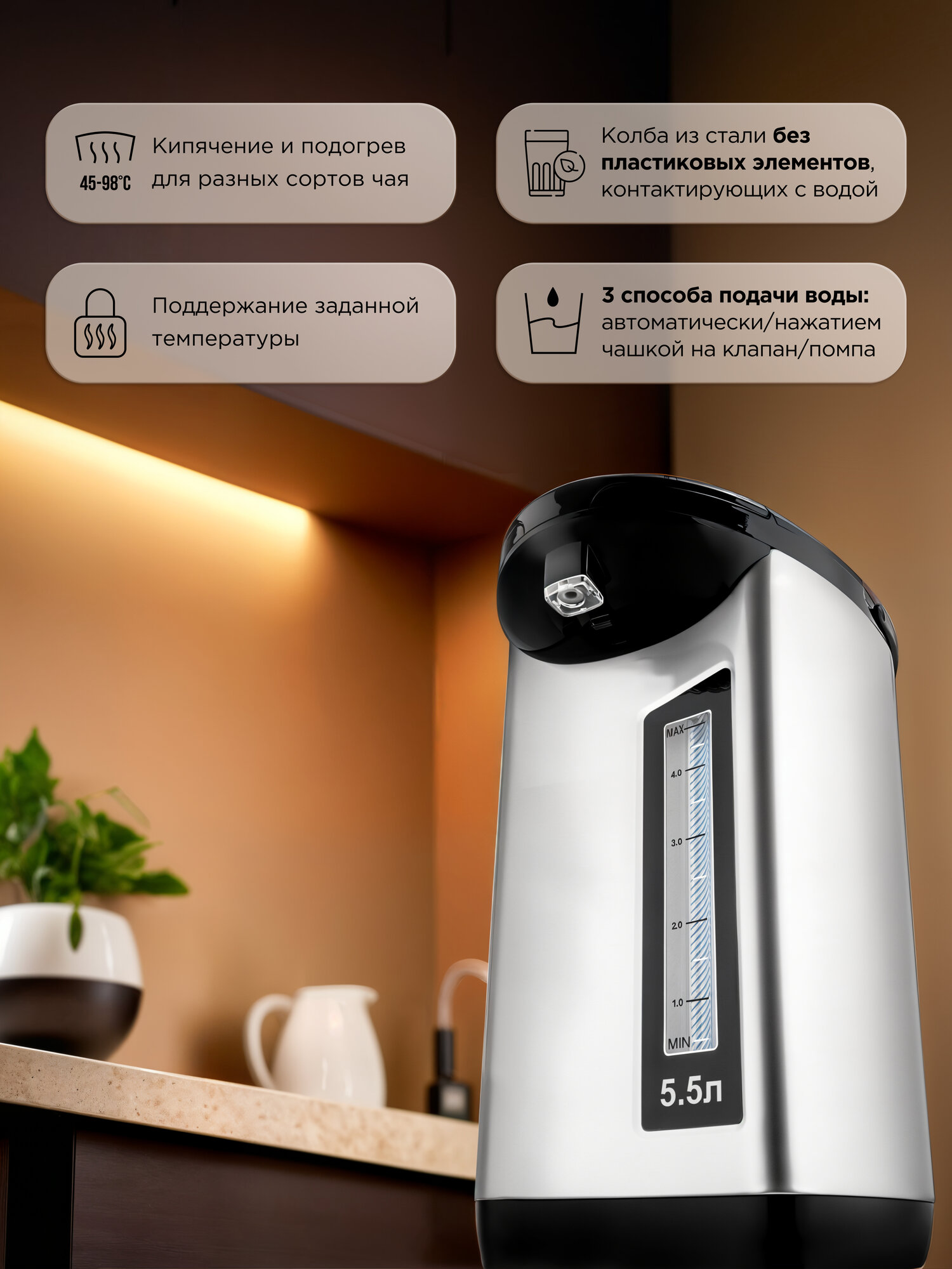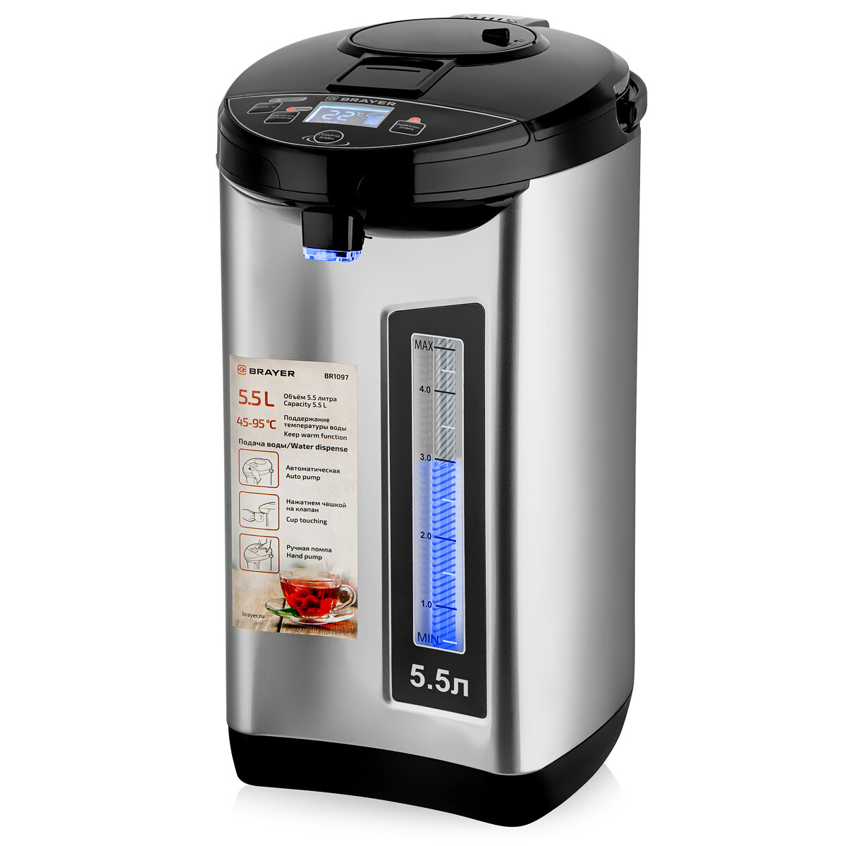 Купить Термопот BRAYER BR1097, 750Вт, 5,5л, 3 способа подачи воды, LCD-дисплей, поддержка и выбор температуры, черный/серебро