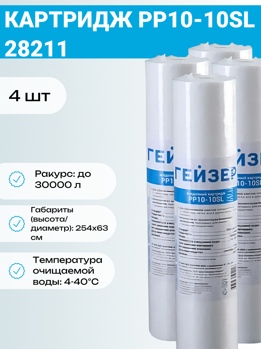 Ниже Вы можете прочитать отзывы на Картридж Гейзер "PP10-10SL", для очистки воды, от механических примесей, 4 шт, ознакомится с подробными характеристиками, посмотреть интересные обзоры и фотографии на Картридж Гейзер "PP10-10SL", для очистки воды, от механических примесей, 4 шт.