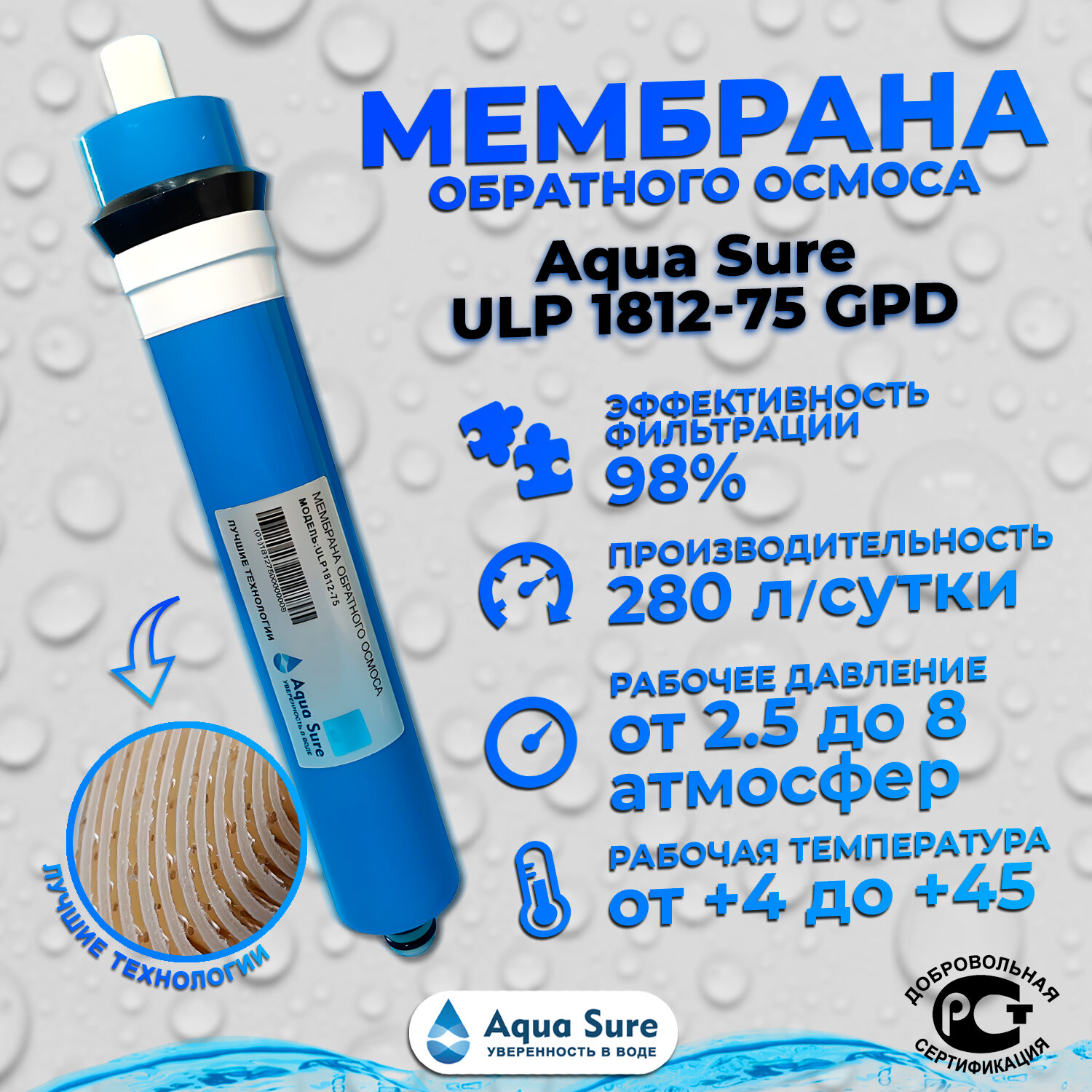 Мембрана обратного осмоса 1812-75 gpd совместима с системами Aquapro, Raifil, Аквафор, Гейзер, Барьер, Atoll, Aquatech интересное: