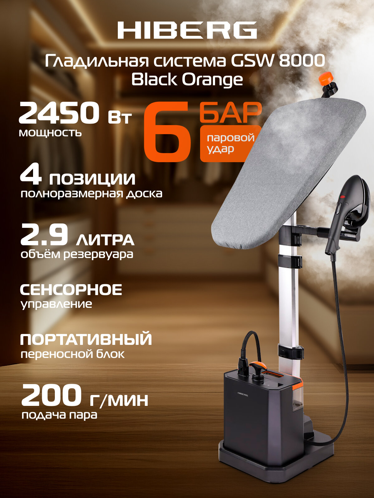 Купить Гладильная система паровая HIBERG GSW 8000 BLACK ORANGE 3 в 1 мощностью 2450 Вт и объемом 2,9 л с 4 регулировками доски