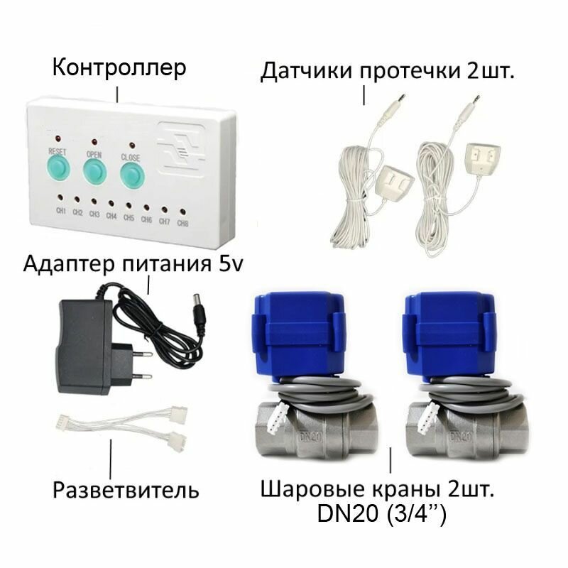 Купить Система защиты от протечек воды (2 крана 3/4", 2 датчика по 6 метров) Water Leakage Alarm для фильтра Родничок, дома или квартиры.