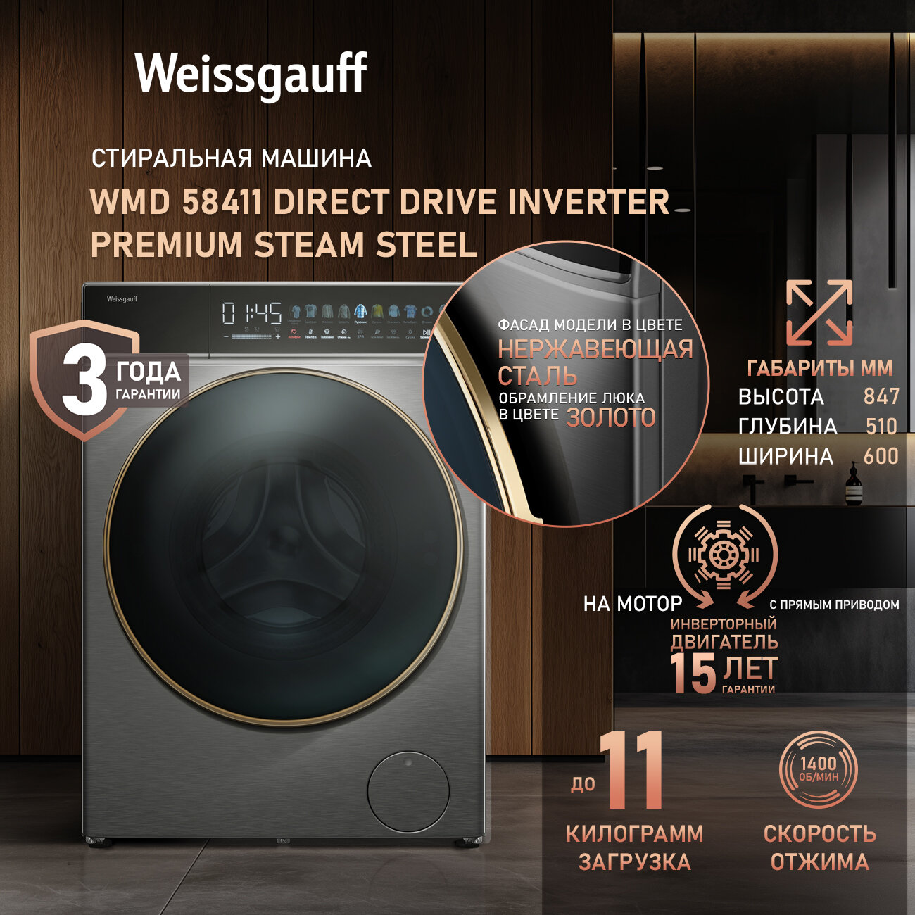 Cтиральная машина с сушкой, прямым приводом Weissgauff WMD 58411 Direct Drive Inverter Premium Steam Steel интересное:
