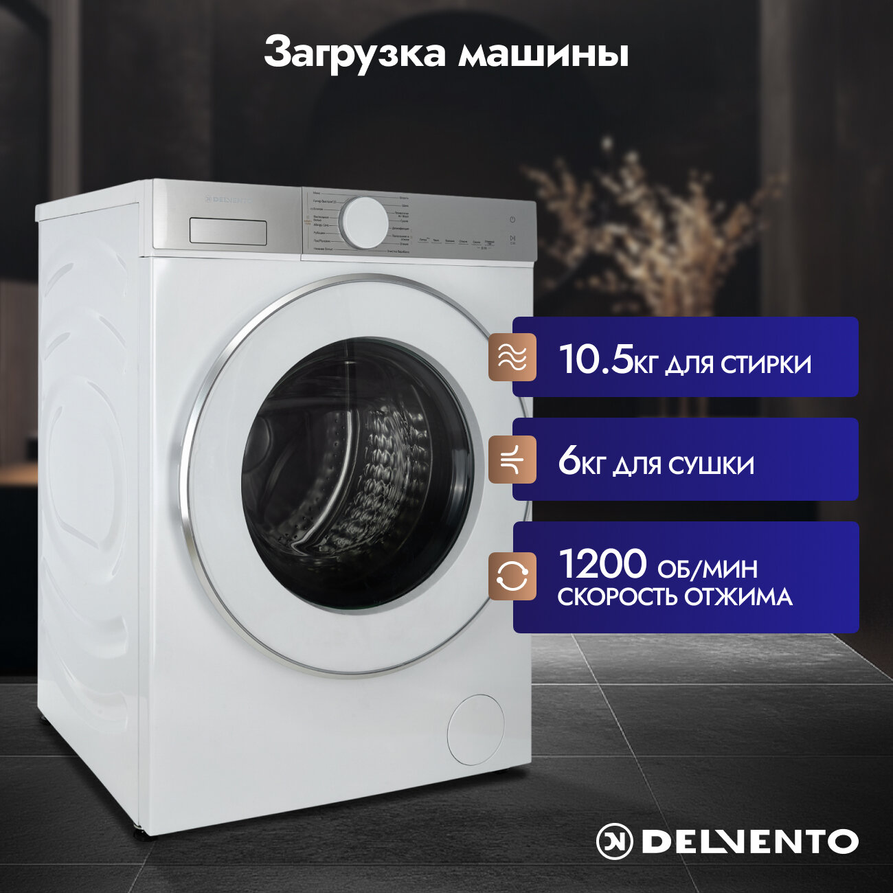 Стиральная машина с сушкой DELVENTO VHS701 / 10,5 кг / сушка 6 кг. / прямой привод / инвертор /1200 об. мин / 14 программ / отложенный старт 24 ч. / гарантия 3 года