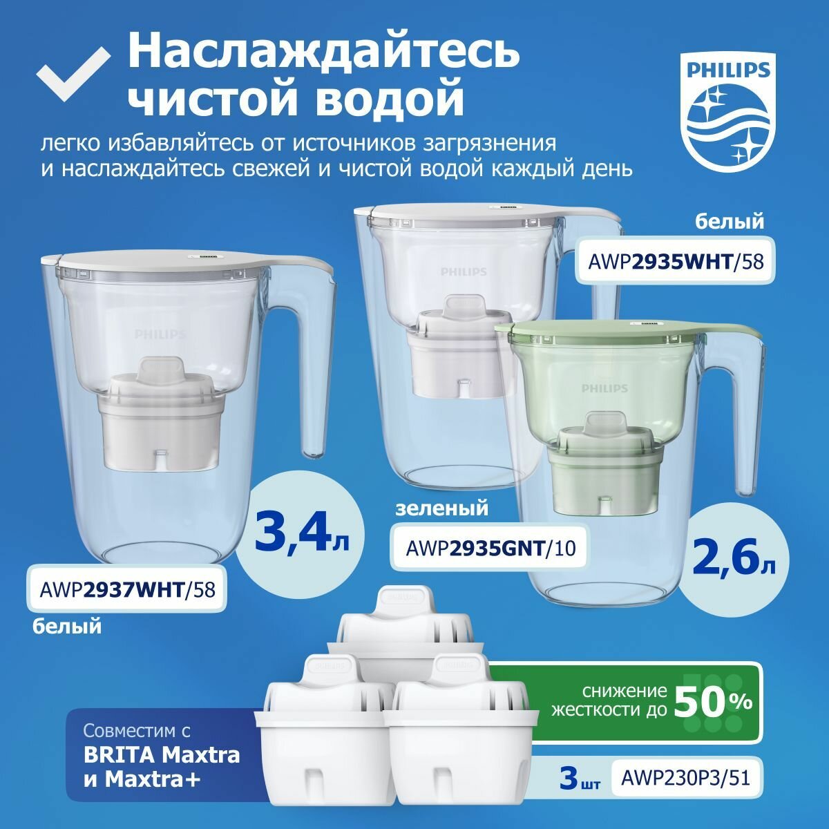 Комплект кувшин Philips AWP2935WHT+сменные картриджи для жесткой воды Philips AWP230P3, 3шт интересное: