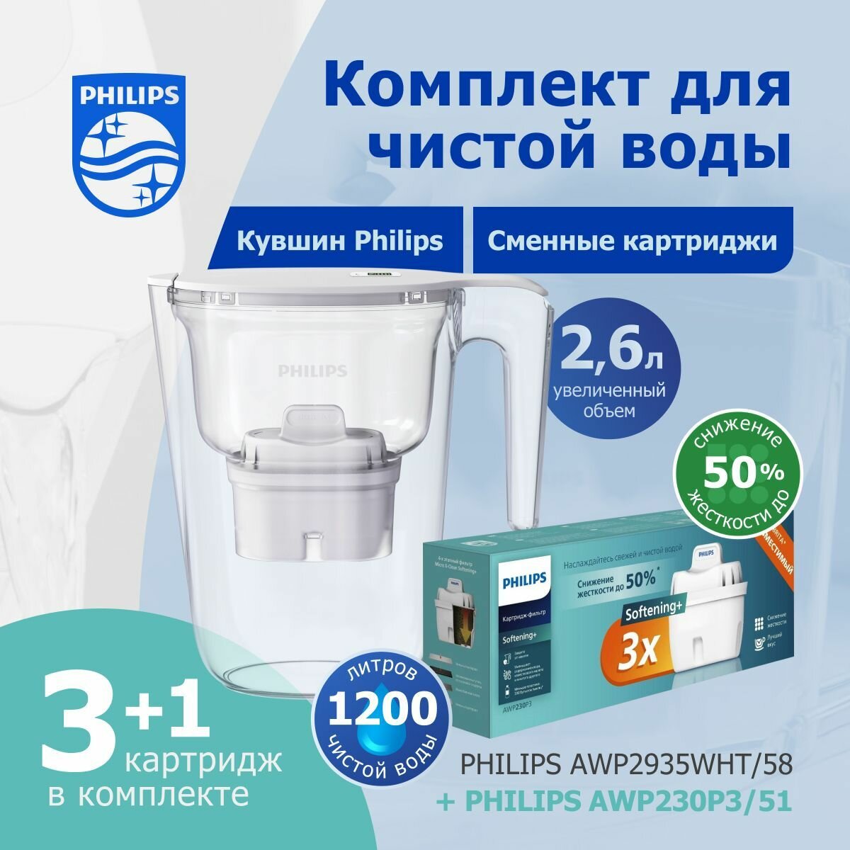 Купить Комплект кувшин Philips AWP2935WHT+сменные картриджи для жесткой воды Philips AWP230P3, 3шт