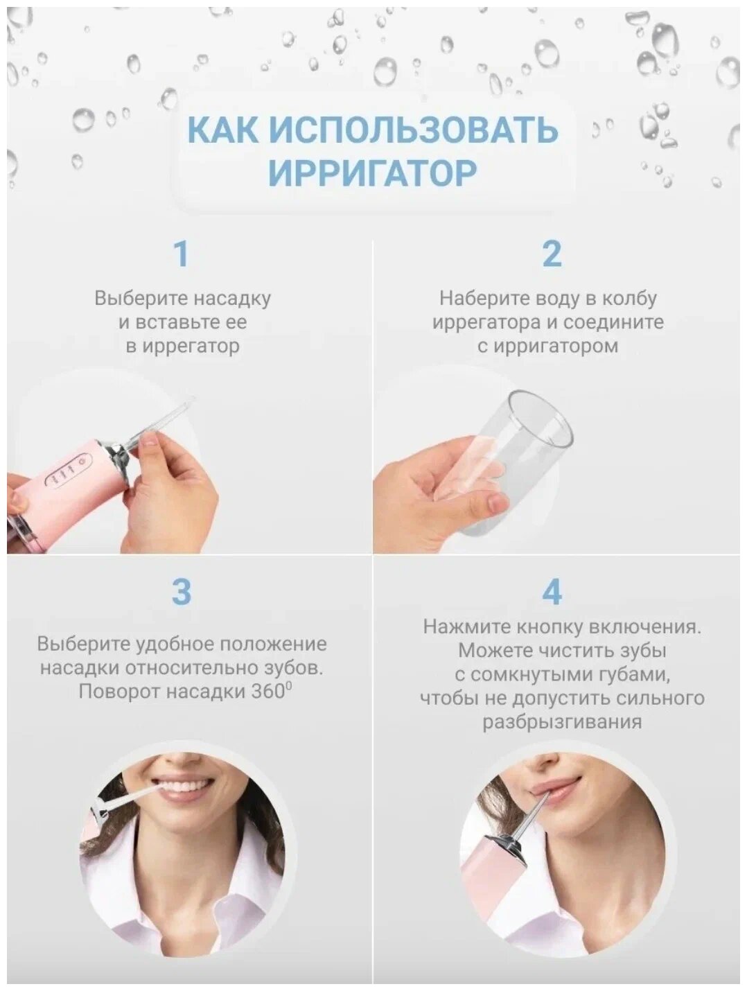 Ирригатор для полости рта. Портативный ирригатор. Ирригатор со сменными 4 насадками голубой интересное: