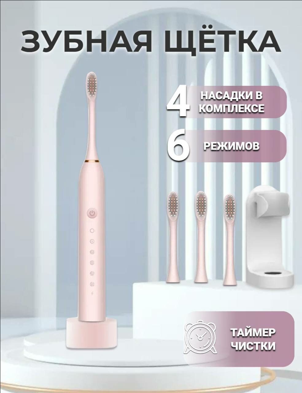 Электрическая зубная щетка, взрослая, с зарядкой , с кронштейном 4 насадки, Розовая интересное: